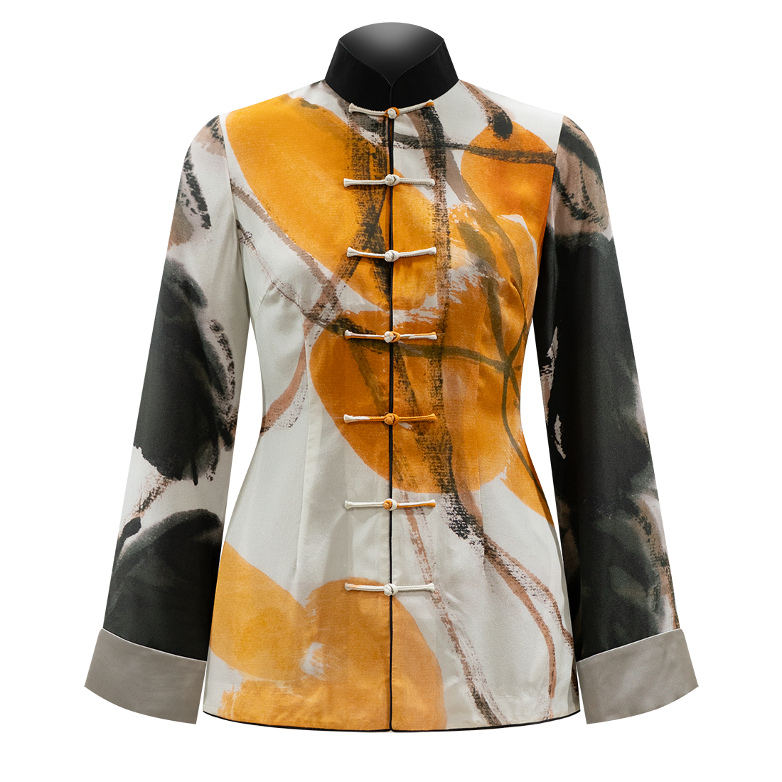 This elegant haute couture tang jacket / kung fu jacket is literally a walking art masterpiece, depicting details from HKMoA’s priceless art painting “Gourds” by world-revered Chinese contemporary master artist Qi Baishi. Adorned with Sparkle signature lambskin Mandarin collar