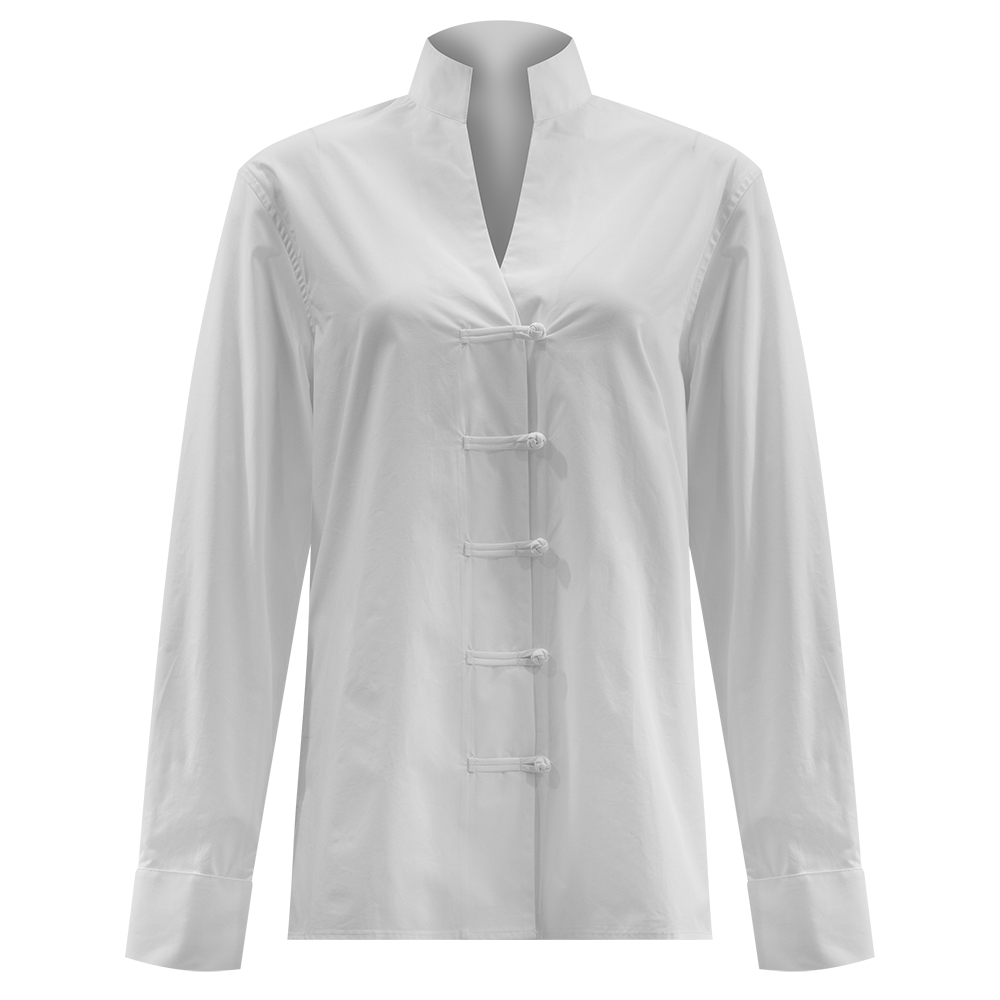 This cotton dress shirt is every woman’s wardrobe essential item. Featuring our brand signature side-toggle closure Chinese knot buttons, with a standing collar inspired by the Mandarin collar and detachable Chinese knot cufflinks let you wear the shirt French cuff style or regular shirt style. Available in white or black.