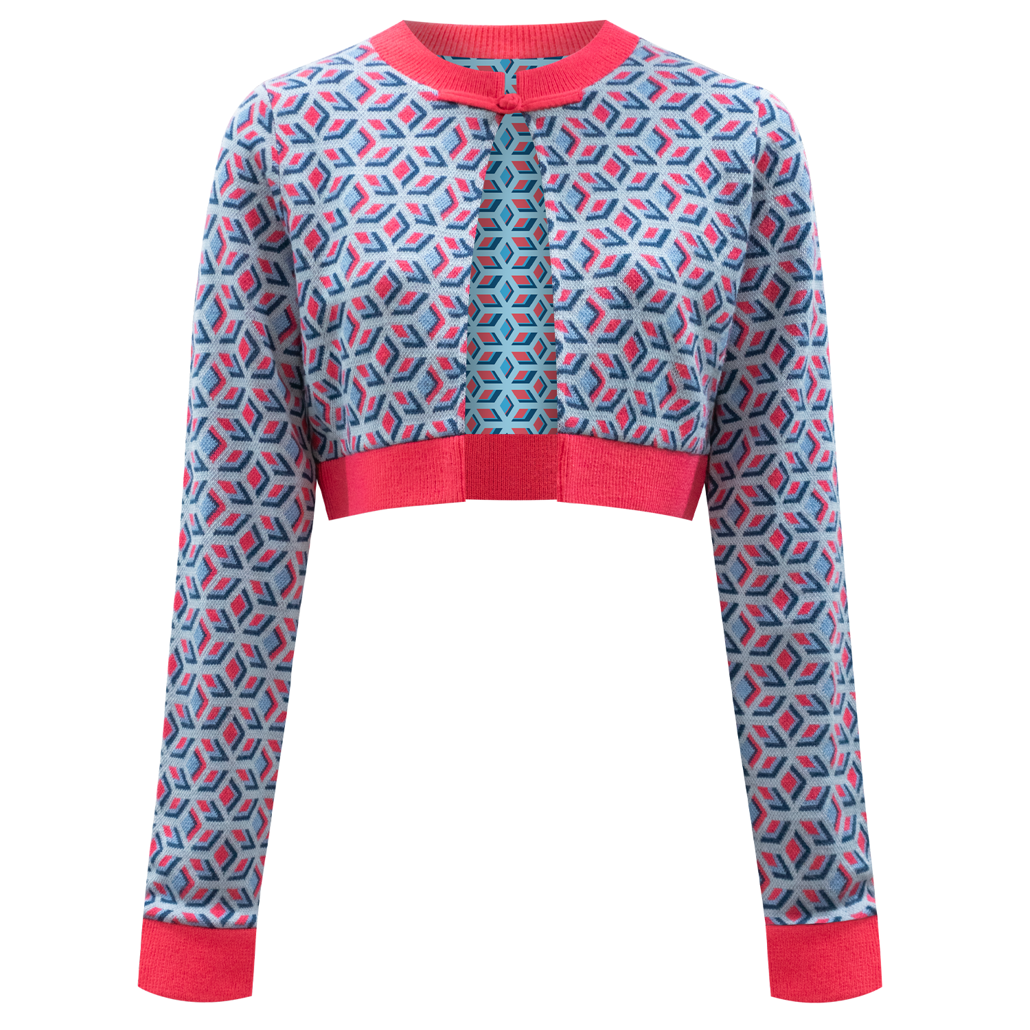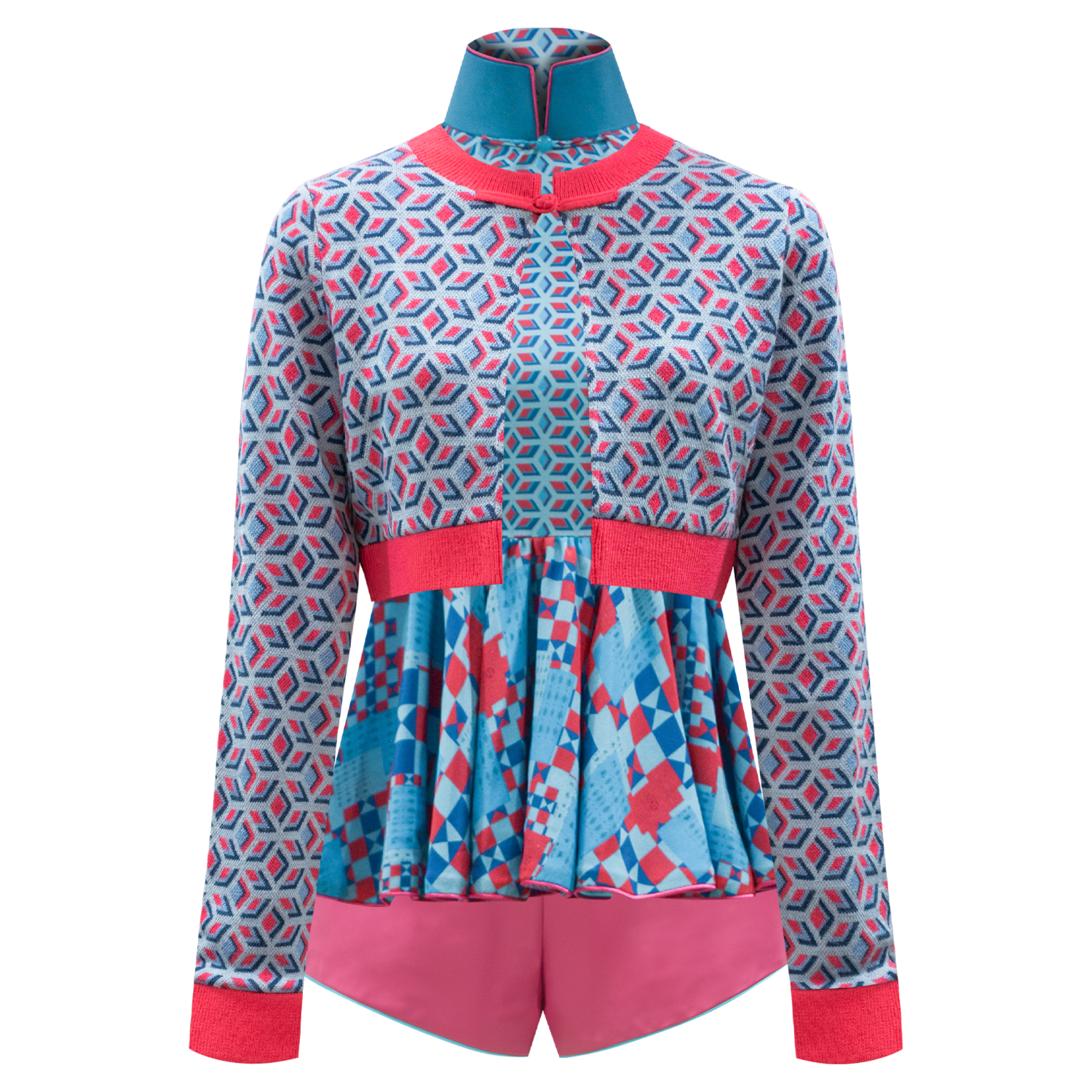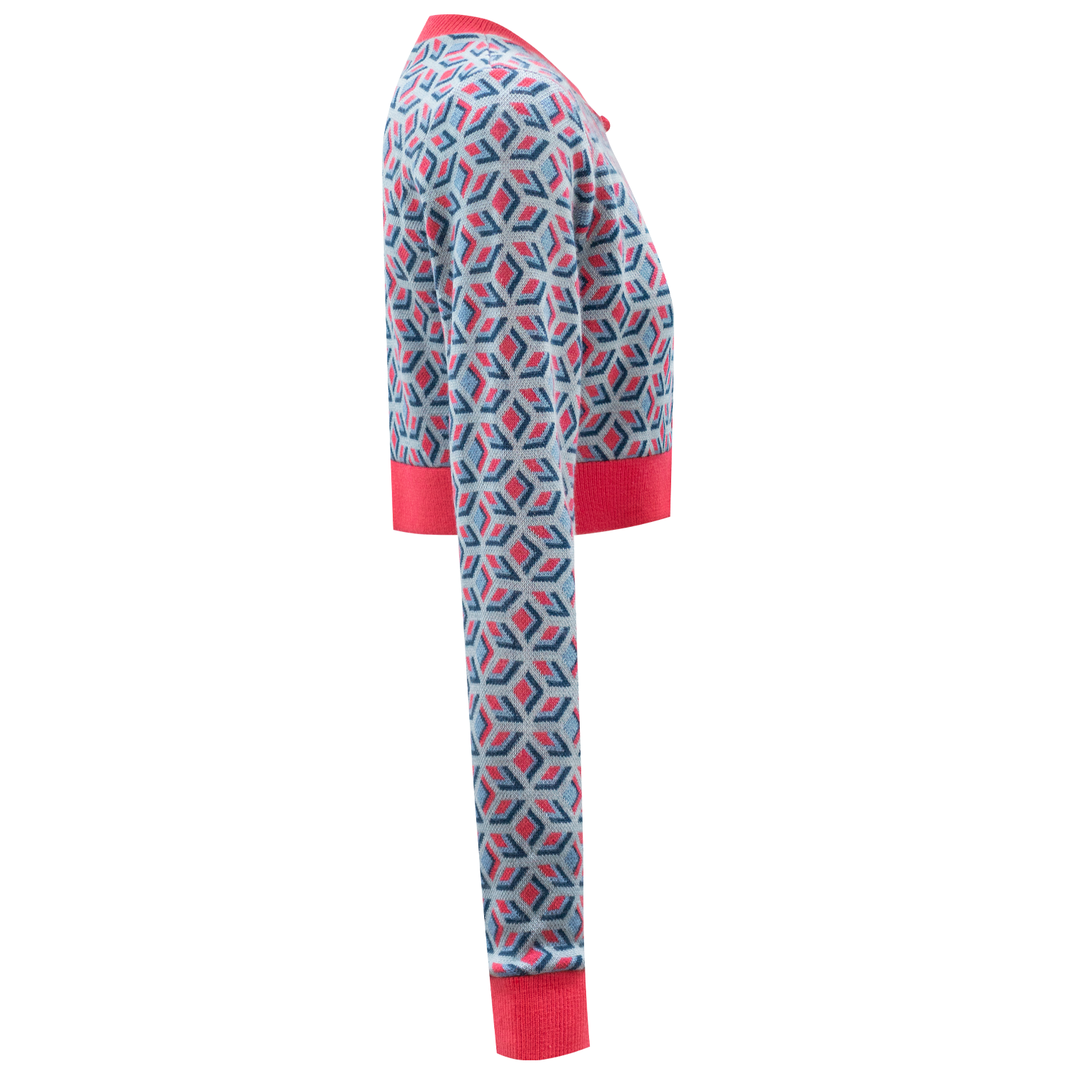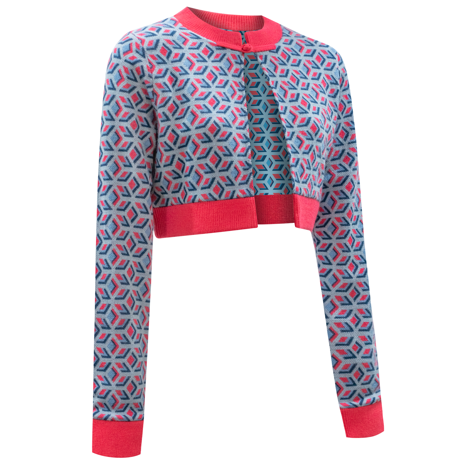 Anti-pilling soft wool-blend knit with pure silk lining in the same pattern. Ribbed knit collar, cuffs and trim in fuchsia add extra structure and dimension to the piece.
