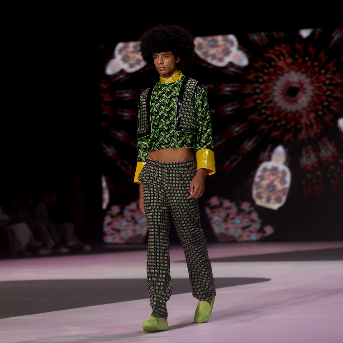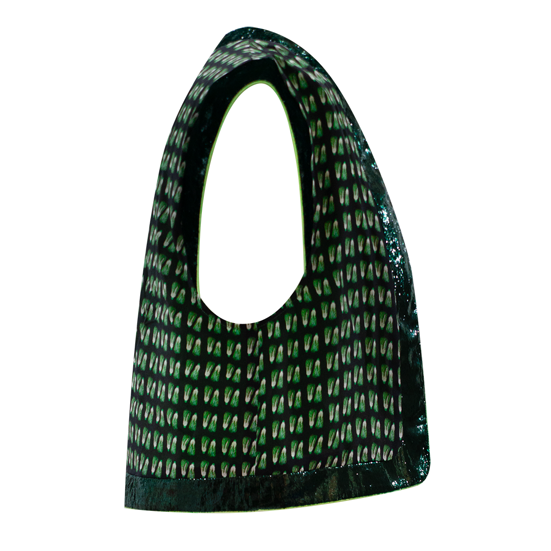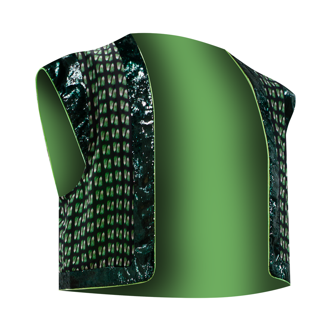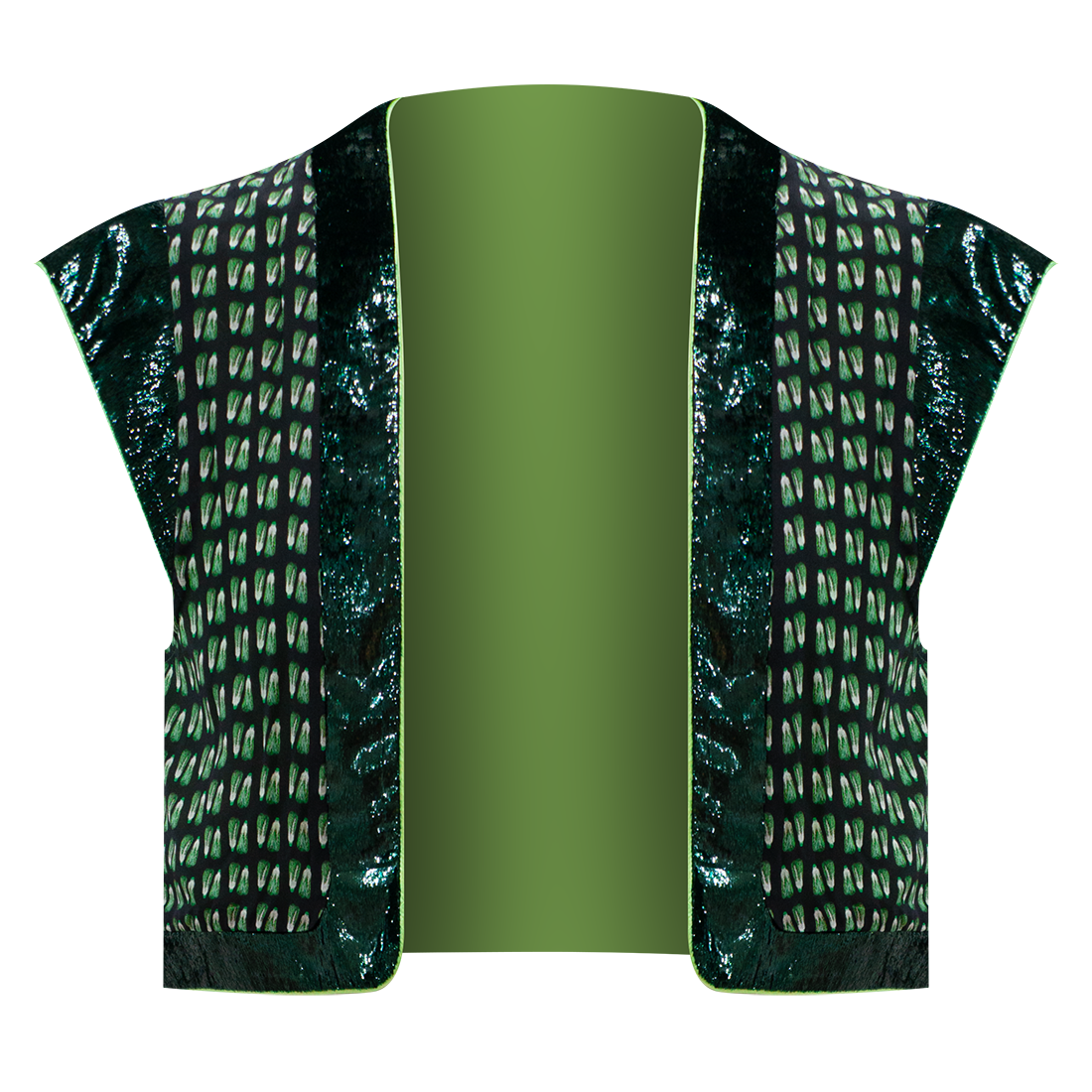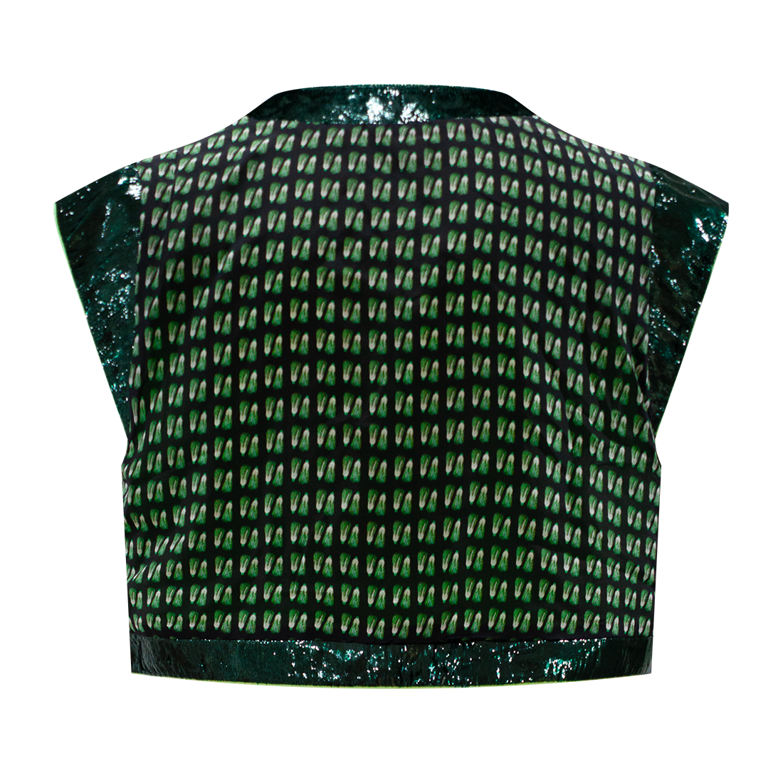Open cropped vest in【BAICAI】pattern inspired by HKMoA’s priceless “Porcelain Green Chinese Cabbage” snuff bottle, adorned with sparkly lurex velvet trims and cuffs in yellow.
