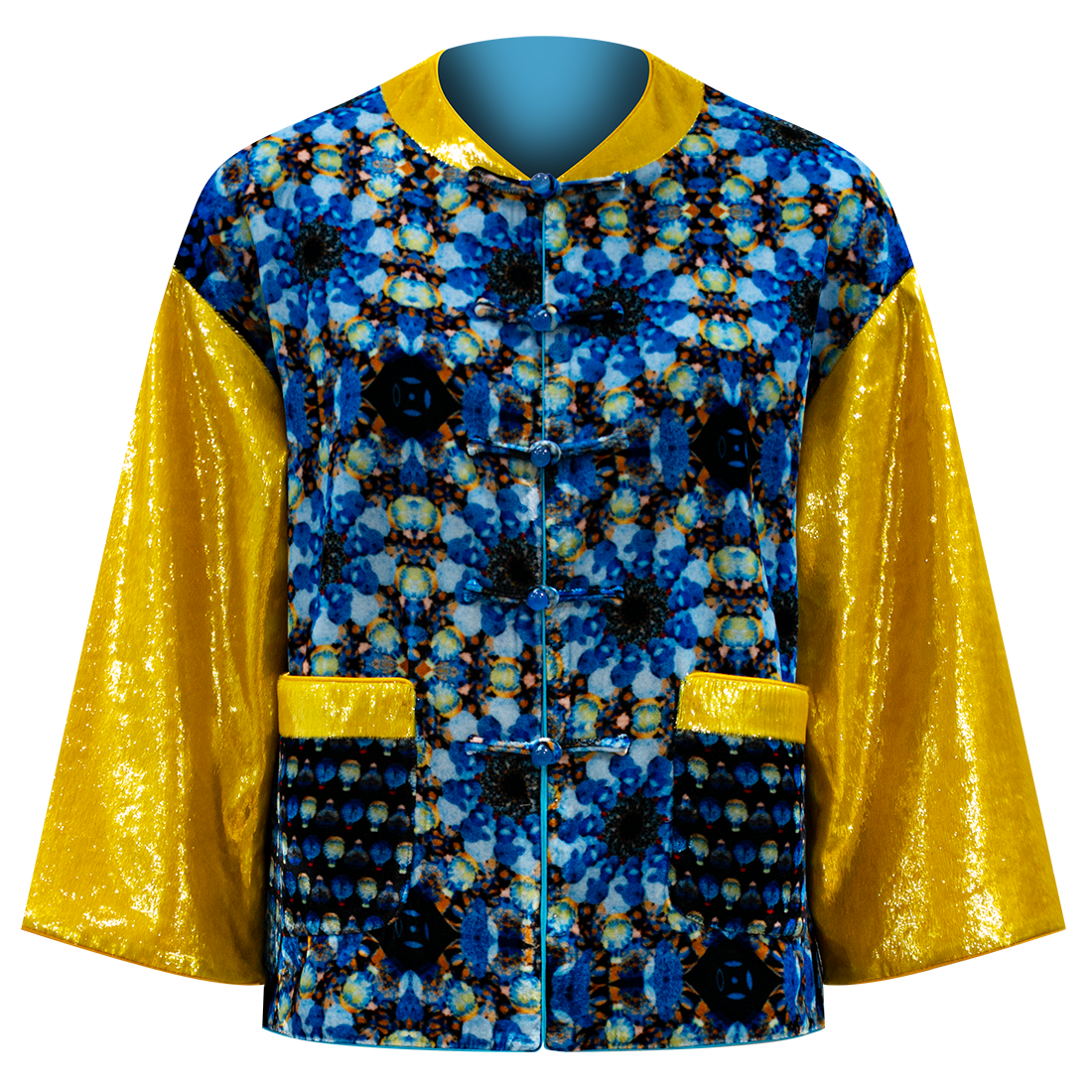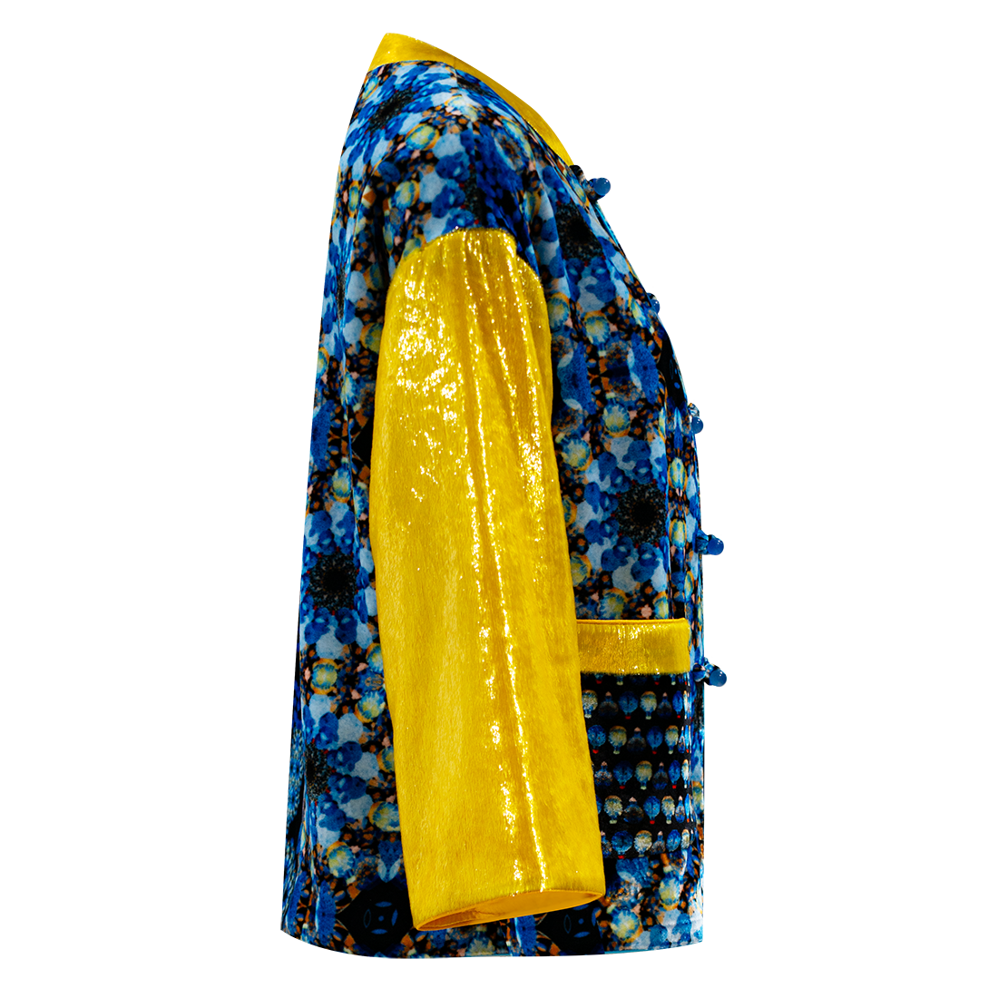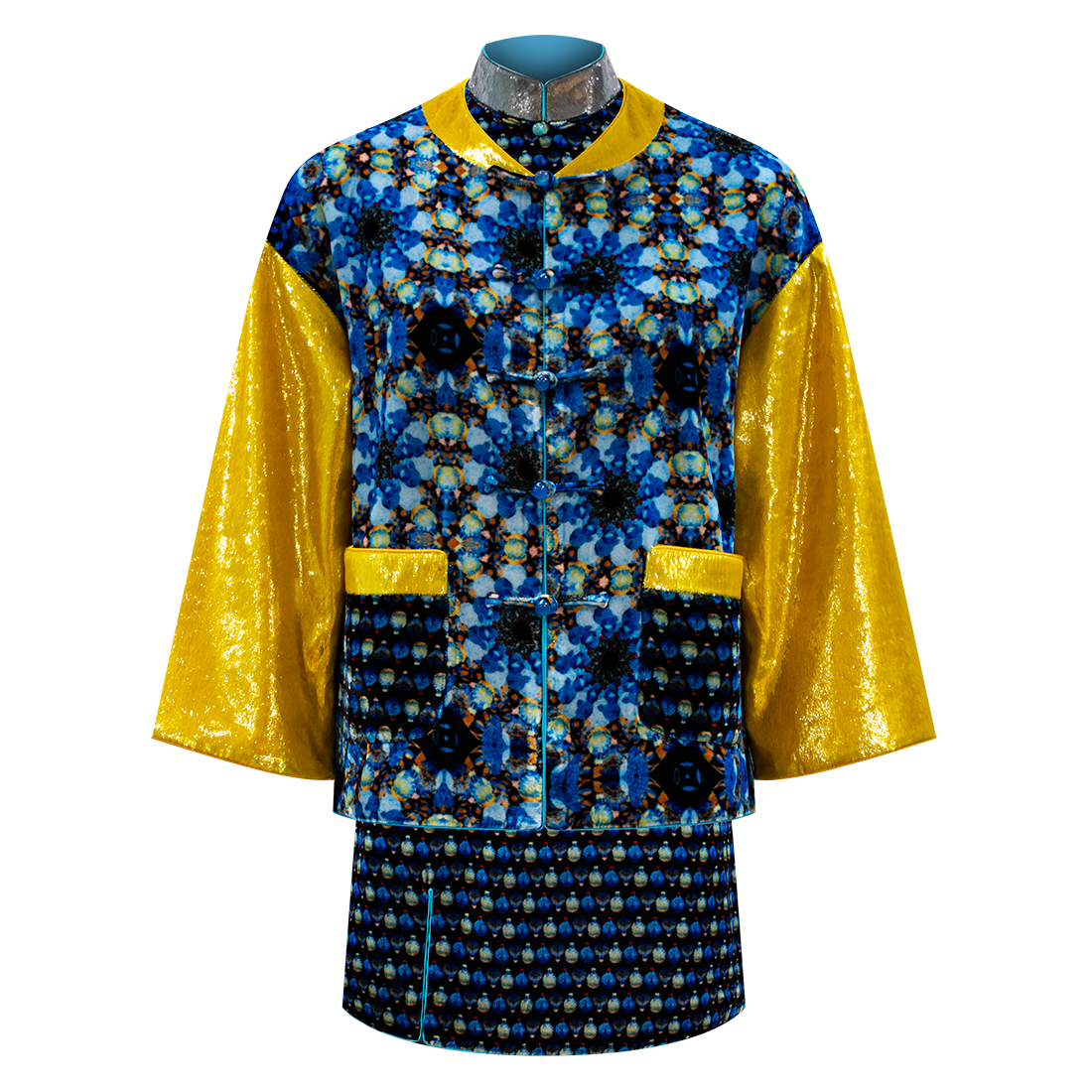 A-shaped velvet cheongsam jacket in 【BLUE GLASS】pattern inspired by HKMoA’s priceless Blue Glass Gold Star Motif, Blue Glass Gold Speckle Motif and Transparent Blue Two Color Overlay Glass Lotus Motif snuff bottles, and adorned with Chinese knot buttons and bracelet sleeves in yellow sparkly lurex velvet.