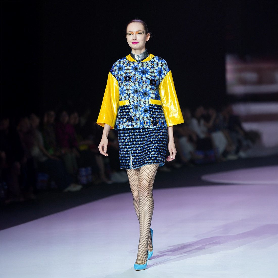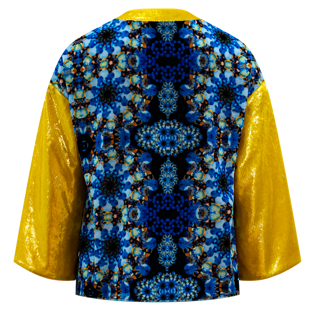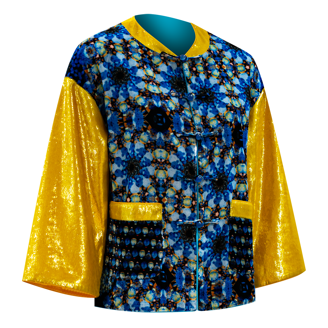 A-shaped velvet cheongsam jacket in 【BLUE GLASS】pattern inspired by HKMoA’s priceless Blue Glass Gold Star Motif, Blue Glass Gold Speckle Motif and Transparent Blue Two Color Overlay Glass Lotus Motif snuff bottles, and adorned with Chinese knot buttons and bracelet sleeves in yellow sparkly lurex velvet.