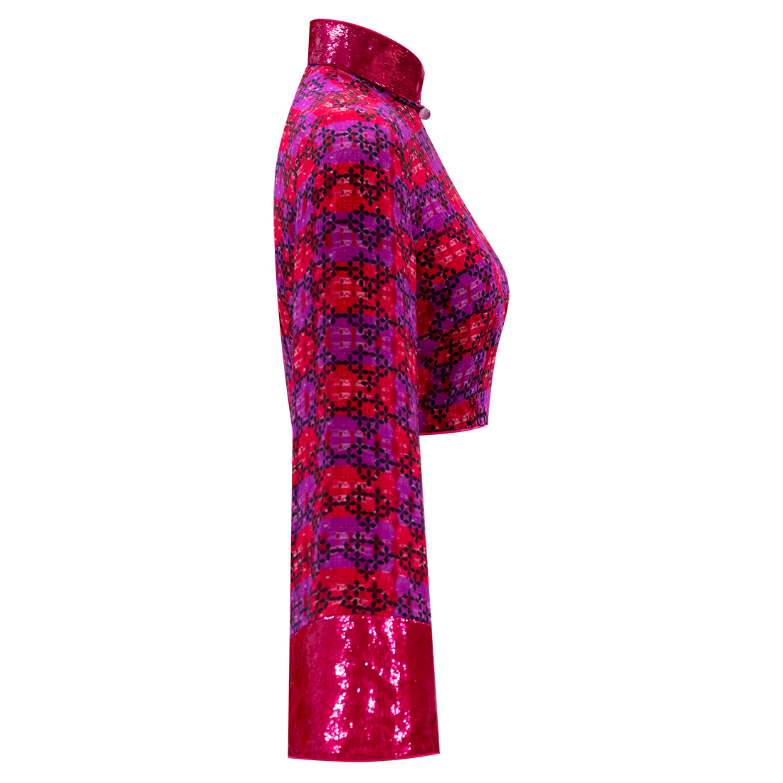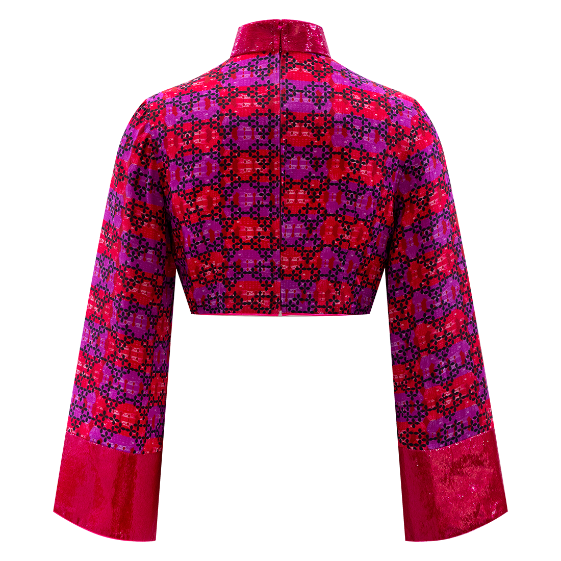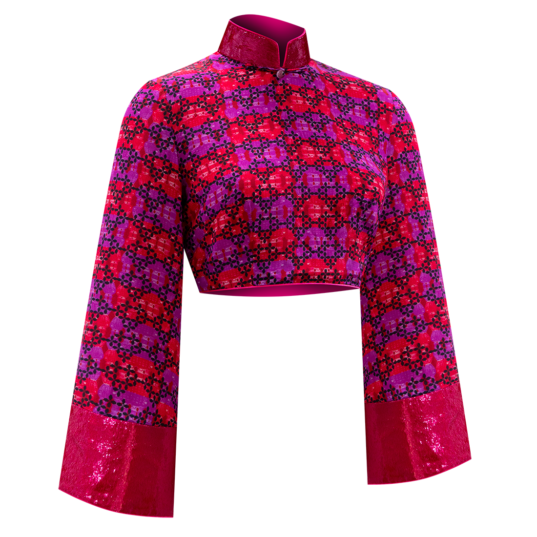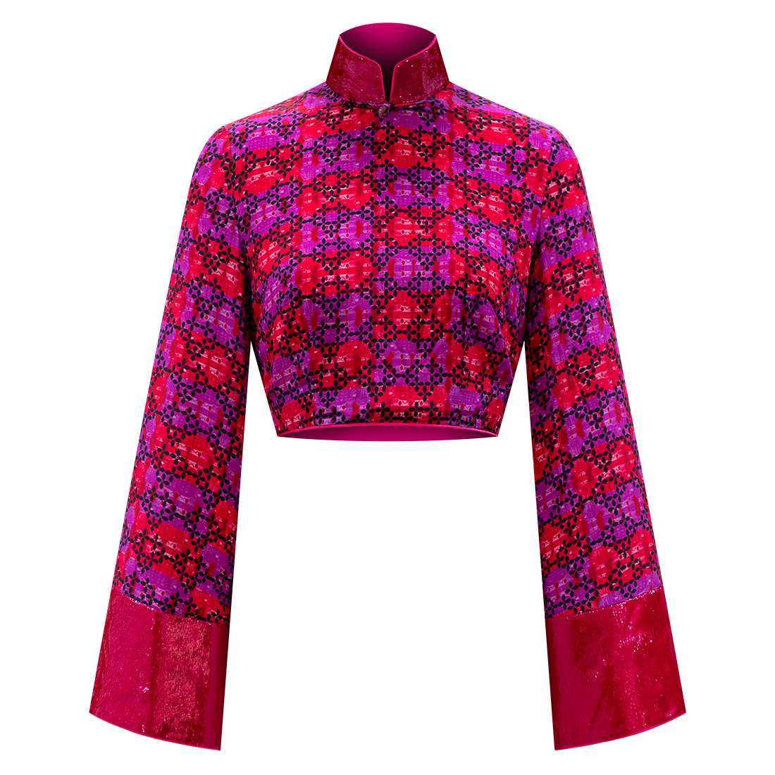Bell-sleeved silk cheongsam cropped top in【DOUBLE HAPPINESS】pattern inspired by HKMoA’s priceless “Famille-Rose Porcelain Double Bottle Imperial Poetry Floral Motif”snuff bottle, adorned with cuffs and mandarin collar in fuchsia sparkly lurex velvet.