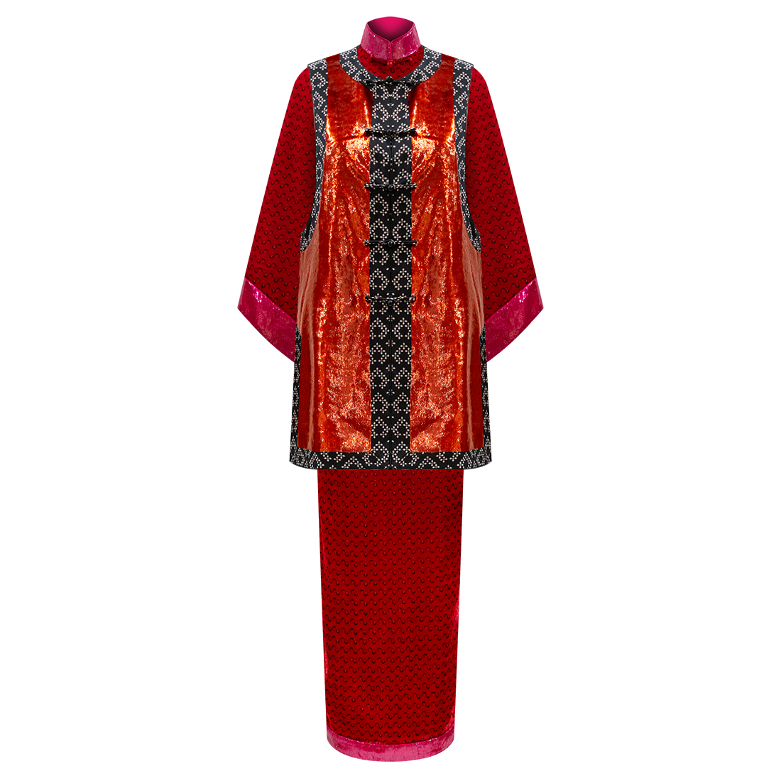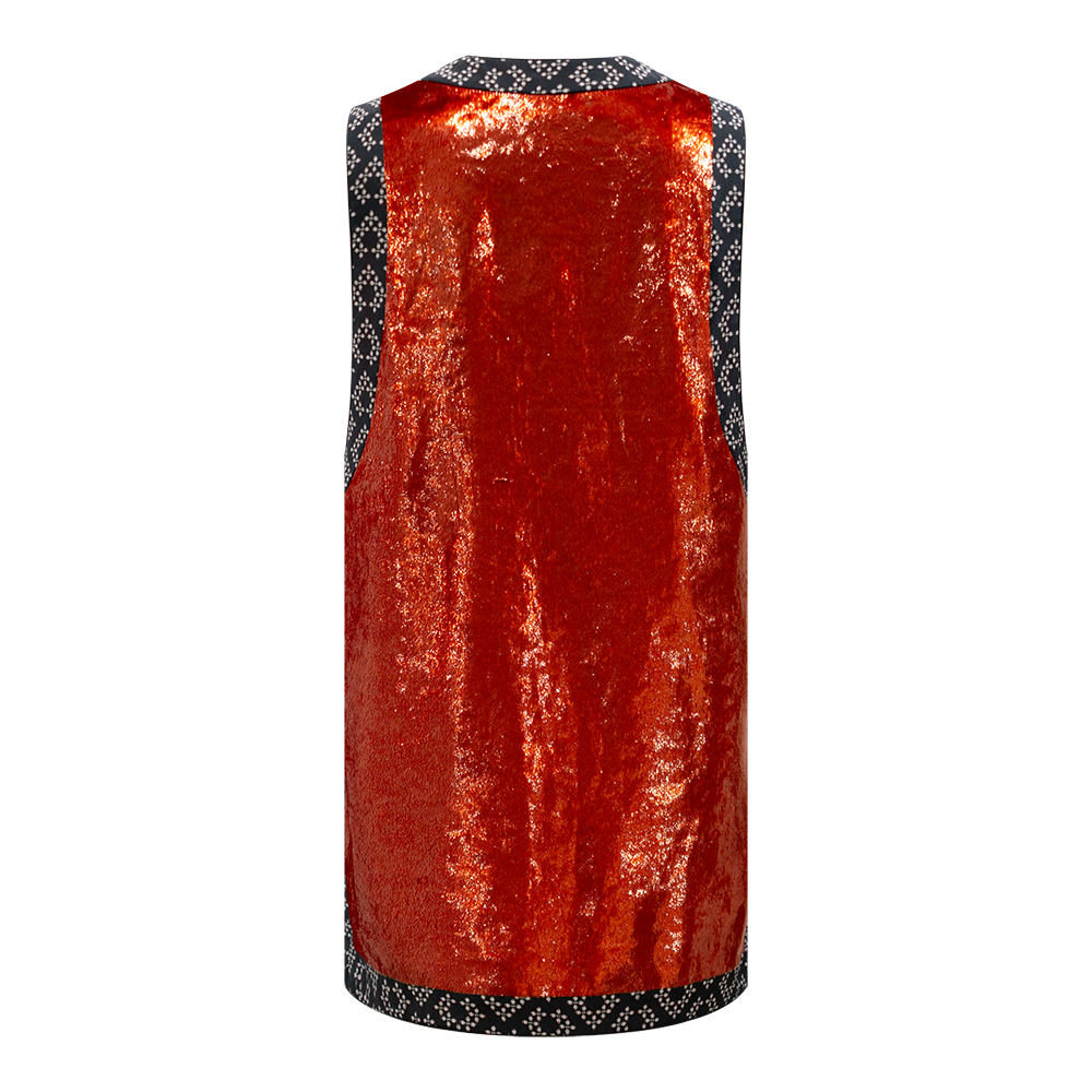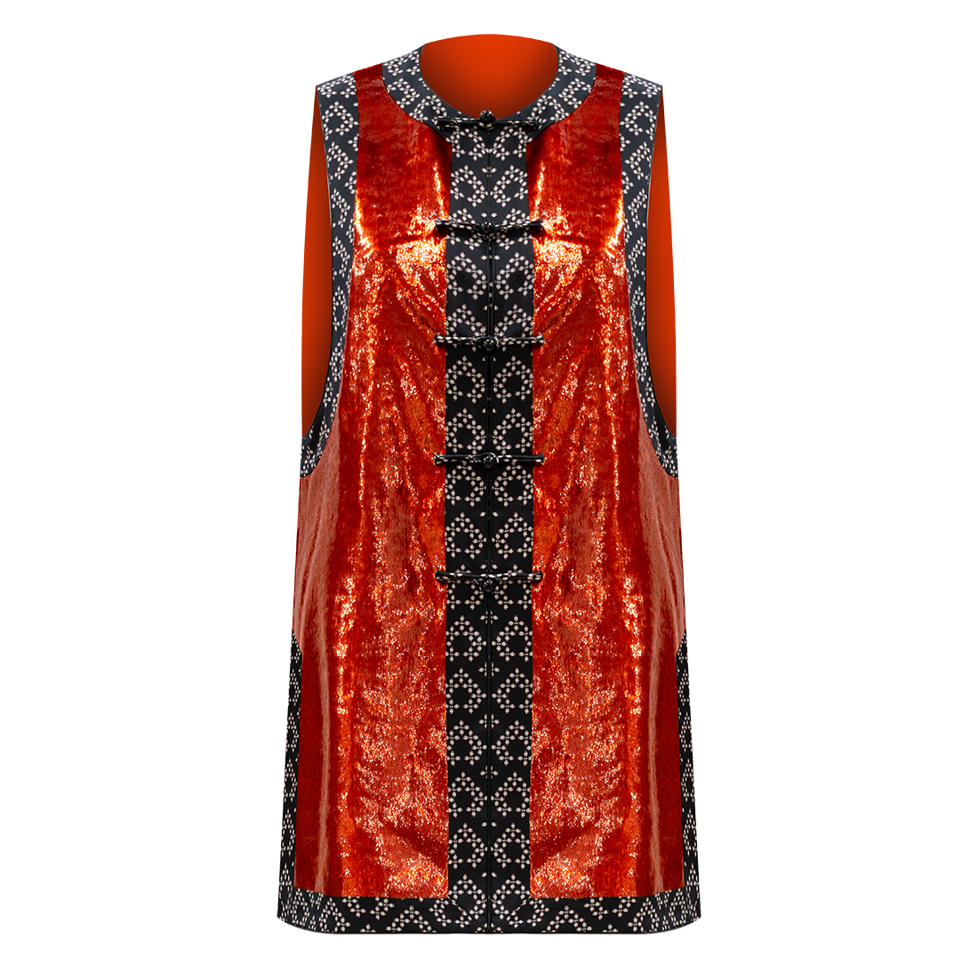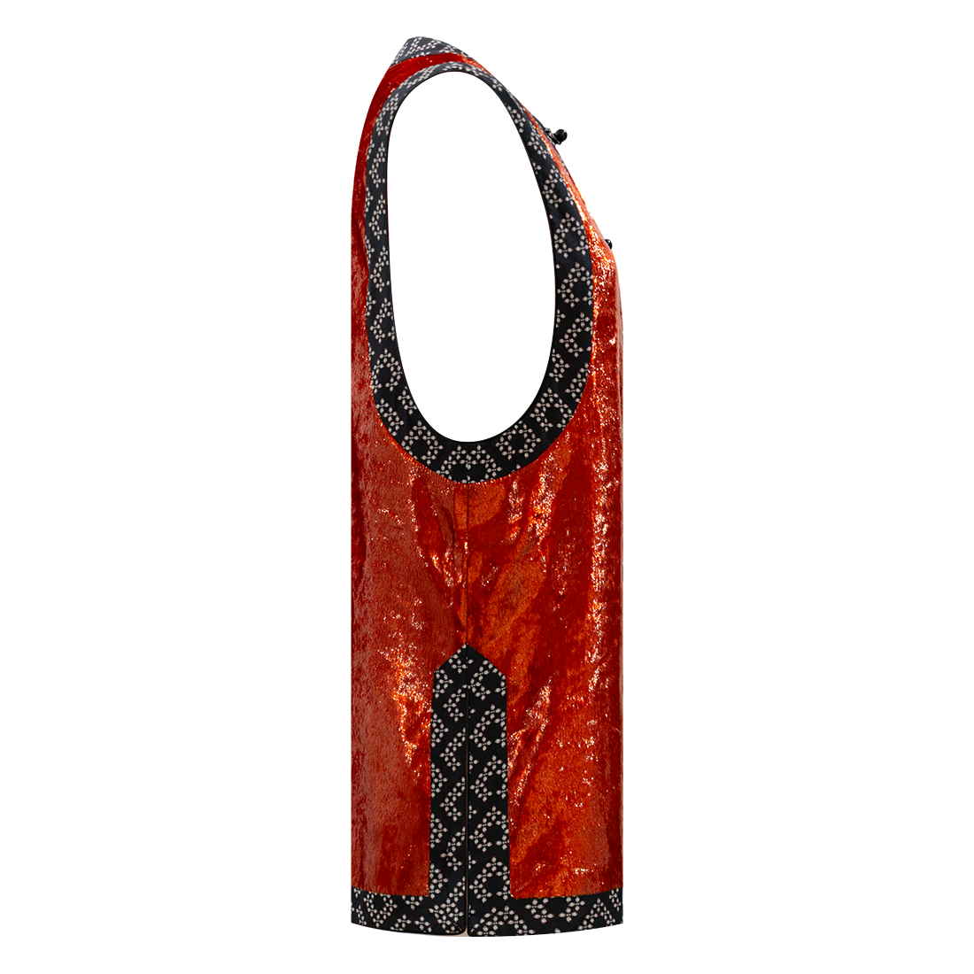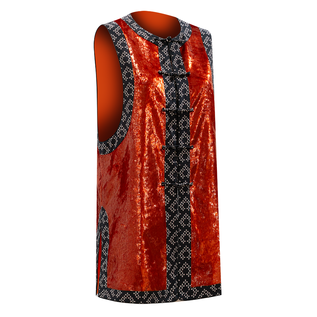 Made of orange sparkly lurex velvet, this long cheongsam vest shimmers with your every move. Chinese knot buttons and black silk trims in【DOUBLE HAPPINESS】pattern inspired by HKMoA’s priceless “Famille-Rose Porcelain Double Bottle Imperial Poetry Floral Motif” snuff bottle add exquisite details to the piece.