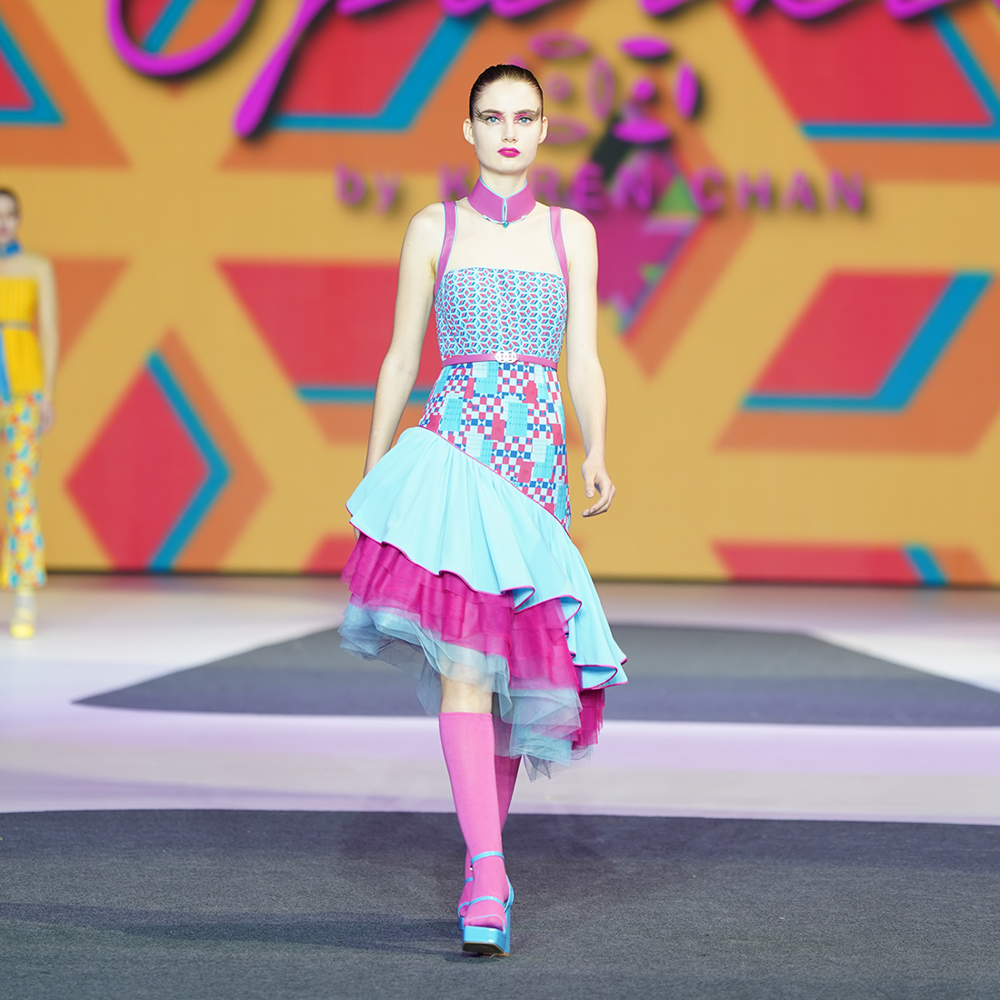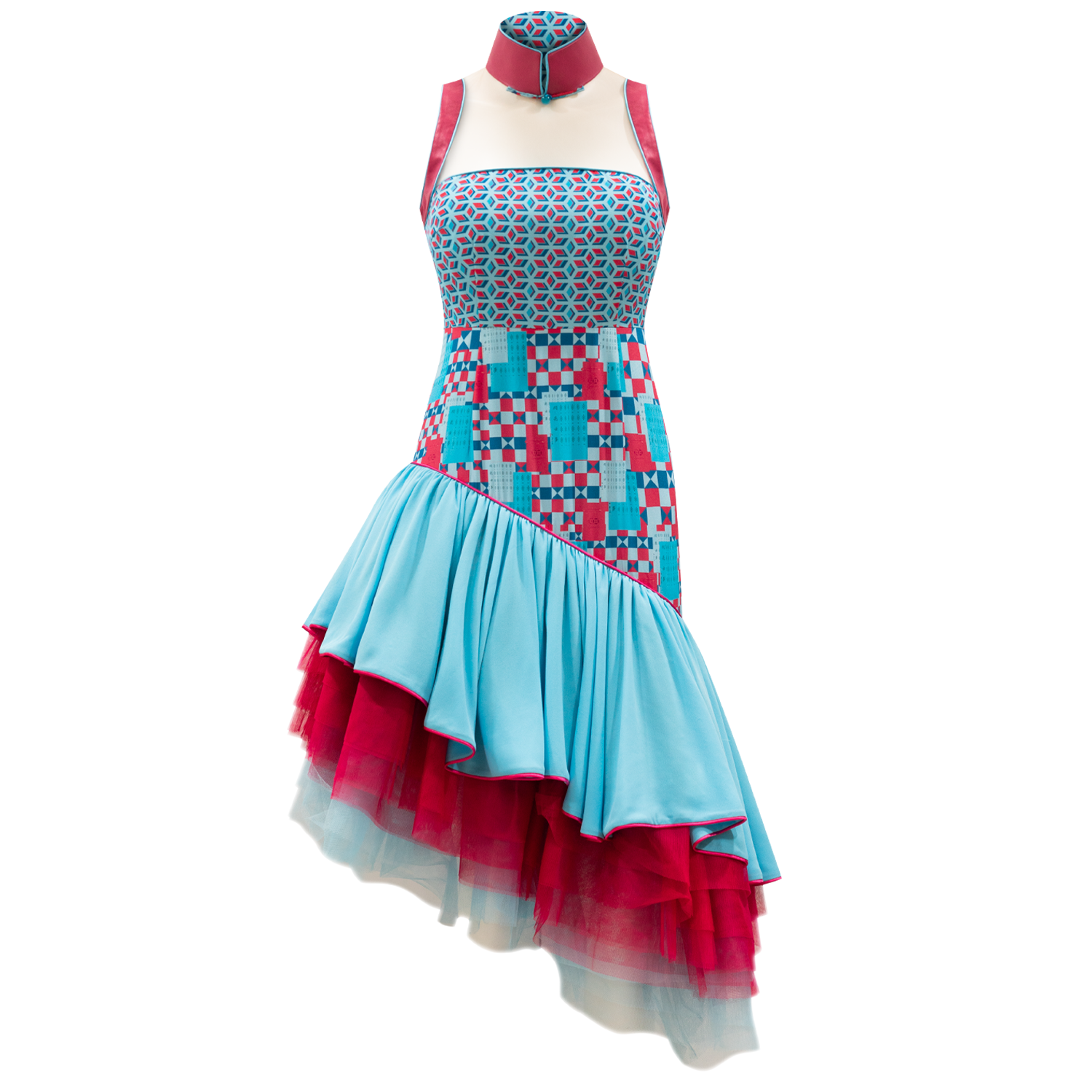 One-piece halter-neck modern cheongsam with bodice in【ANTIQUITY WINDOW】patterned silk and A-line skirt in【GALVINISED IRON】patterned silk, with a blue satin flounce and six layers of blue and fuchsia illusion mesh underneath to create a ballerina tutu effect. The flattering high waistline is inspired by 1950’s Hollywood bombshells, and elongates the silhouette. Brand signature lambskin mandarin collar and shoulder trims in fuchsia, held together with skin-tone illusion mesh, gives the piece an even grander vibe. Perfect for fancy dinners and parties.