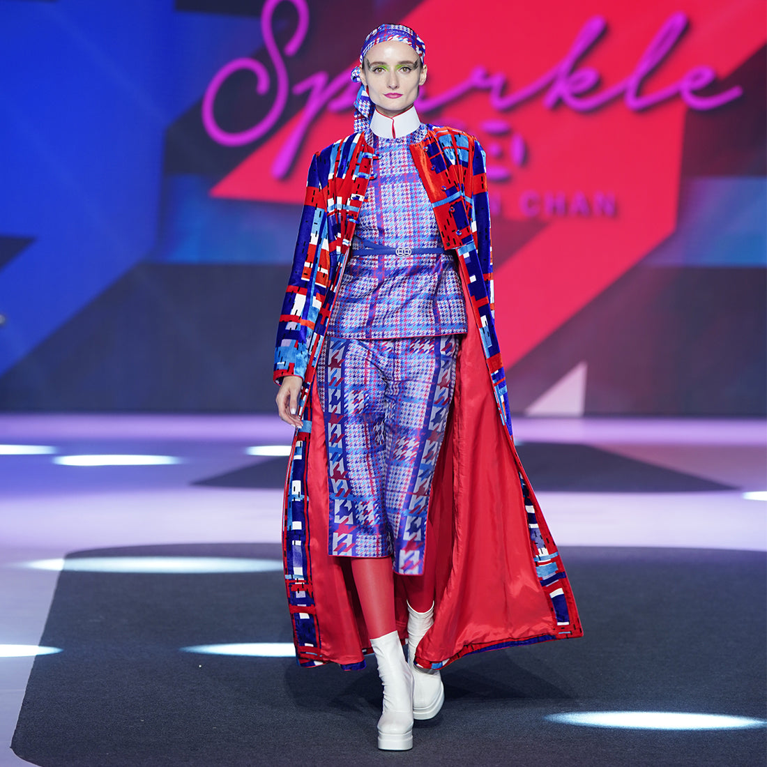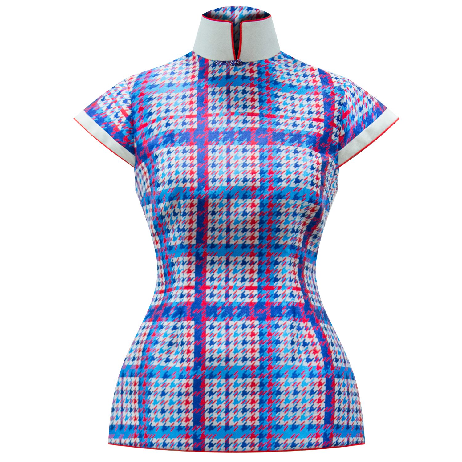 Cheongsam top in small houndstooth brocade with a cinched waistline is a defining physical representation of femininity; accentuated with our brand signature lambskin high mandarin collar in white, lined with【Houndstooth】patterned silk , dainty cap sleeves with white lambskin trim and red satin lining.