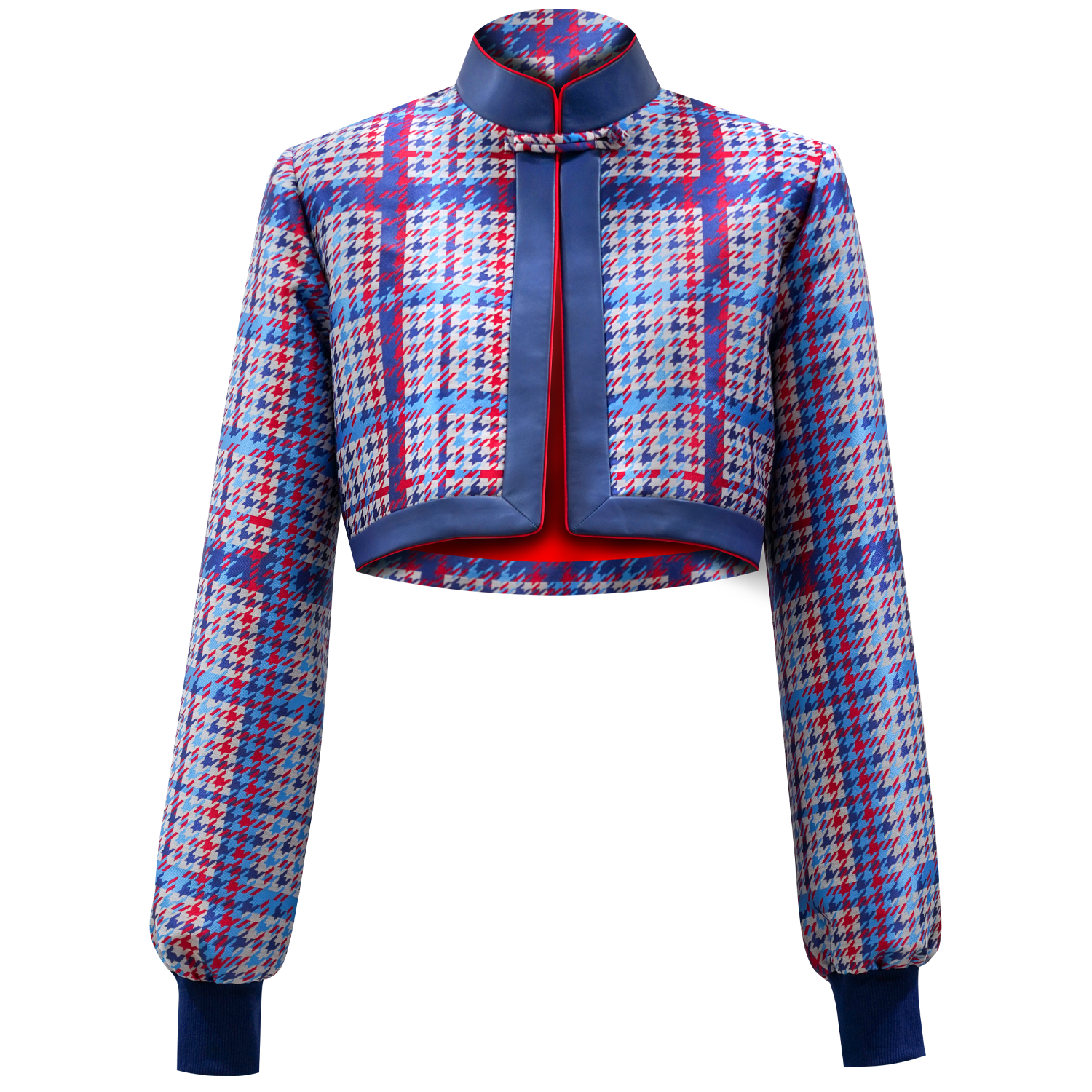 Timeless short brocade jacket, accentuated with our brand signature lambskin mandarin collar in blue and matching lambskin trim, with blue ribbed knit cuffs for extra texture.