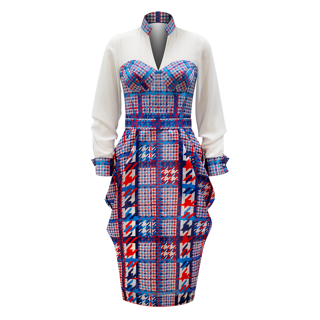 This modern cheongsam with a western silhouette perfectly embodies the brand’s East-meets-West aesthetics; the bodice is made of brocade in【HOUNDSTOOTH BABE】pattern, with white chiffon shoulders and sleeves accentuated with our brand signature mandarin collar and French cuffs with matching Chinese knot buttons in【HOUNDSTOOTH BABE】brocade. The skirt is made of translucent voile in.