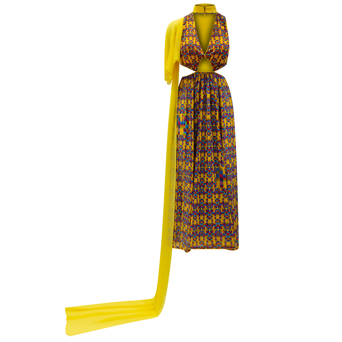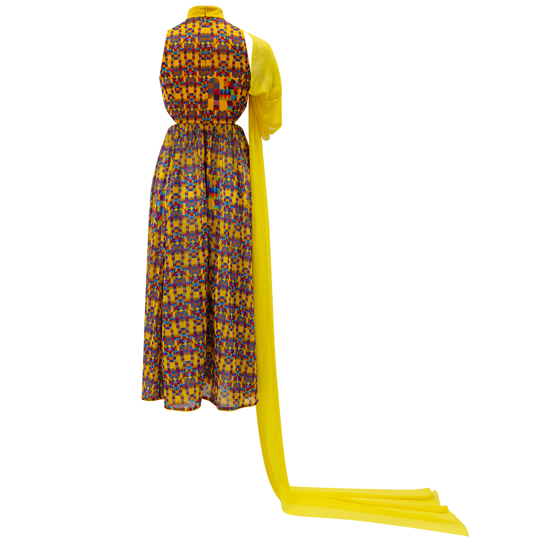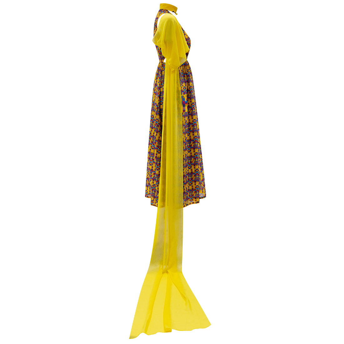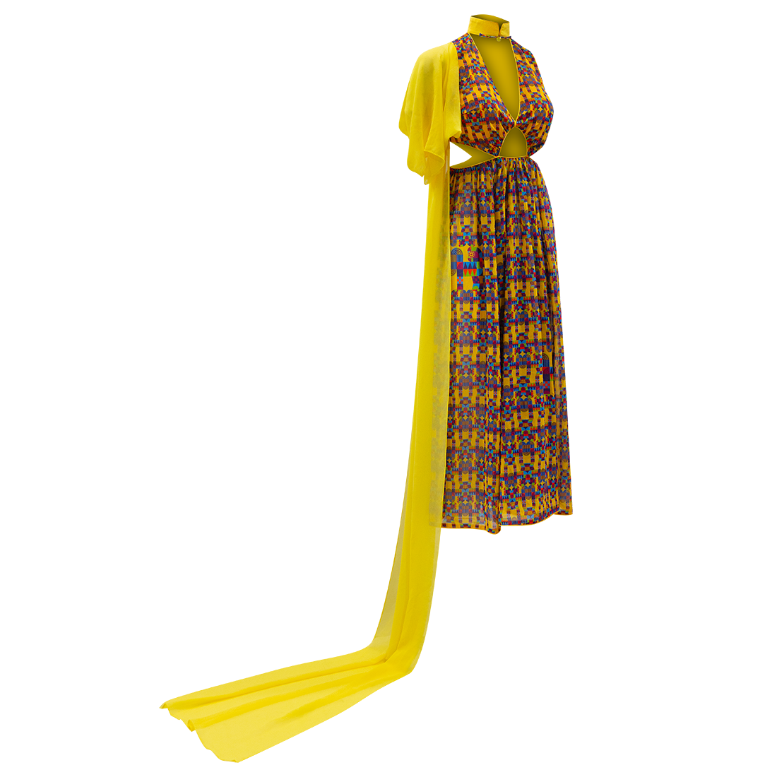 Sexy cheongsam in printed chiffon with a deep V neckline and waist cut out, adorned with a yellow chiffon mandarin collar backed by satin. The long sheer chiffon sash can be worn as a ornamental sleeve or draped across the body.