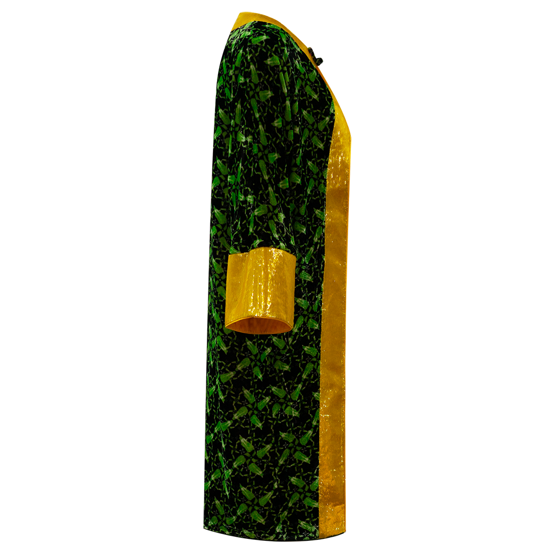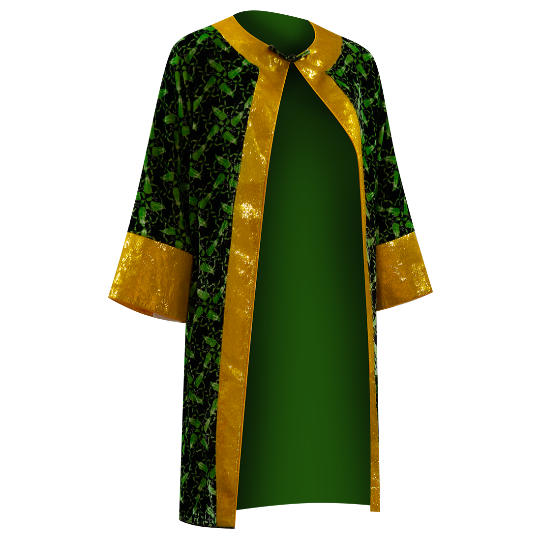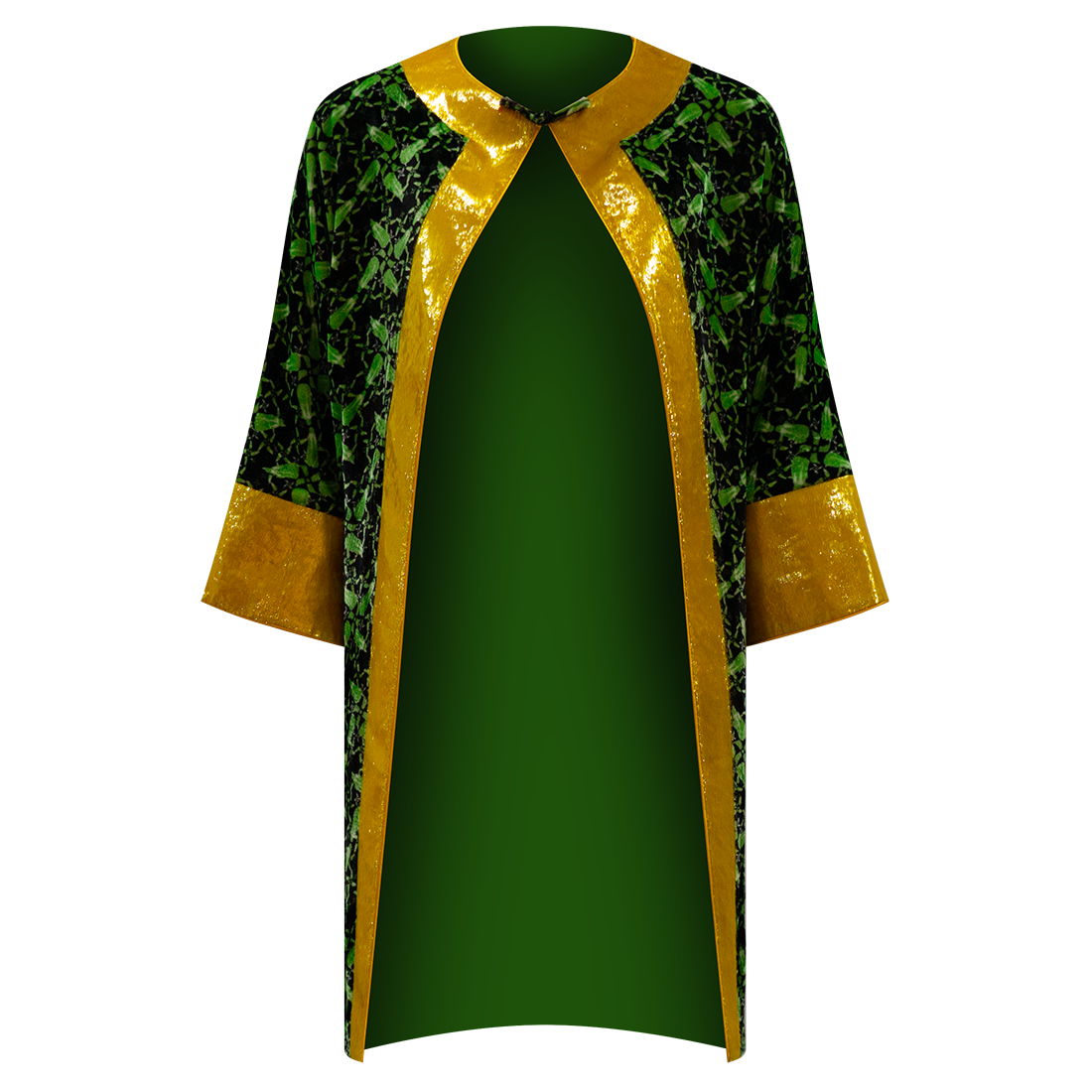 Open velvet long coat in【BAICAI】pattern inspired by HKMoA’s priceless “Porcelain Green Chinese Cabbage” snuff bottle, adorned with sparkly lurex velvet trims and cuffs in yellow. A single Chinese knot button at the collar and bracelet sleeves add distinctive Chinese elements to the piece.