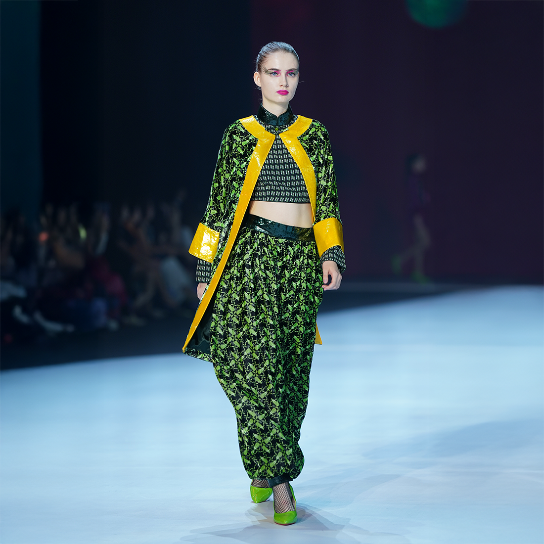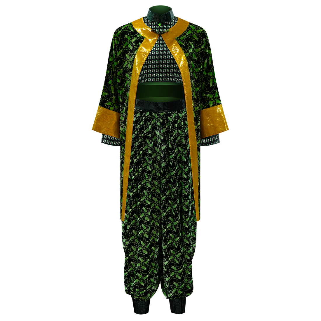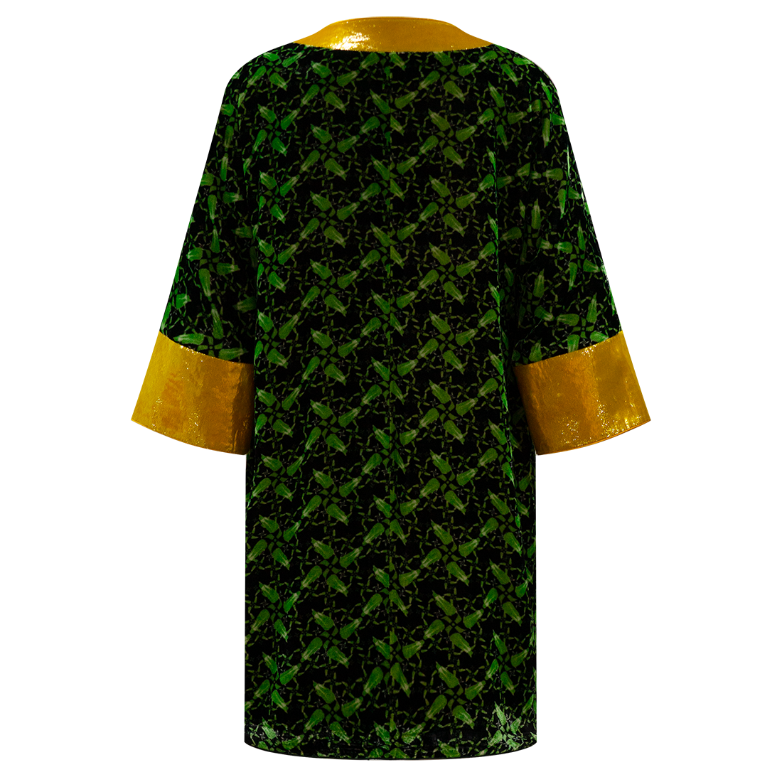 Open velvet long coat in【BAICAI】pattern inspired by HKMoA’s priceless “Porcelain Green Chinese Cabbage” snuff bottle, adorned with sparkly lurex velvet trims and cuffs in yellow. A single Chinese knot button at the collar and bracelet sleeves add distinctive Chinese elements to the piece.