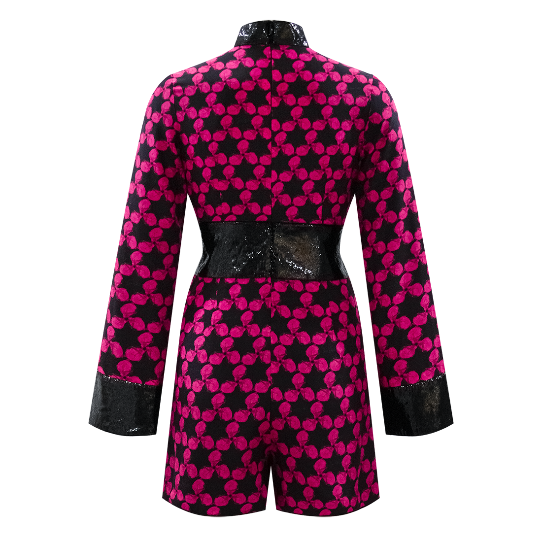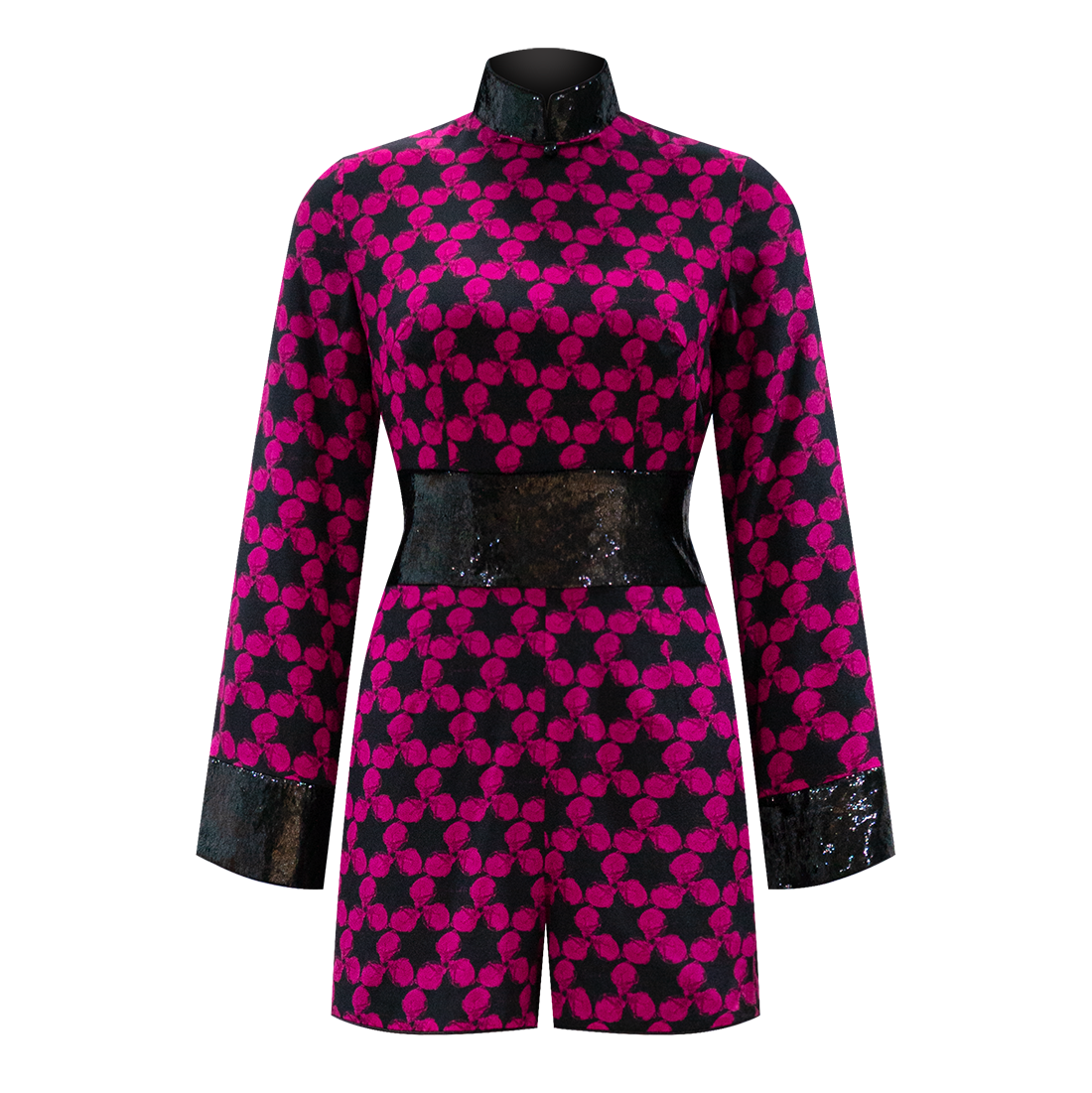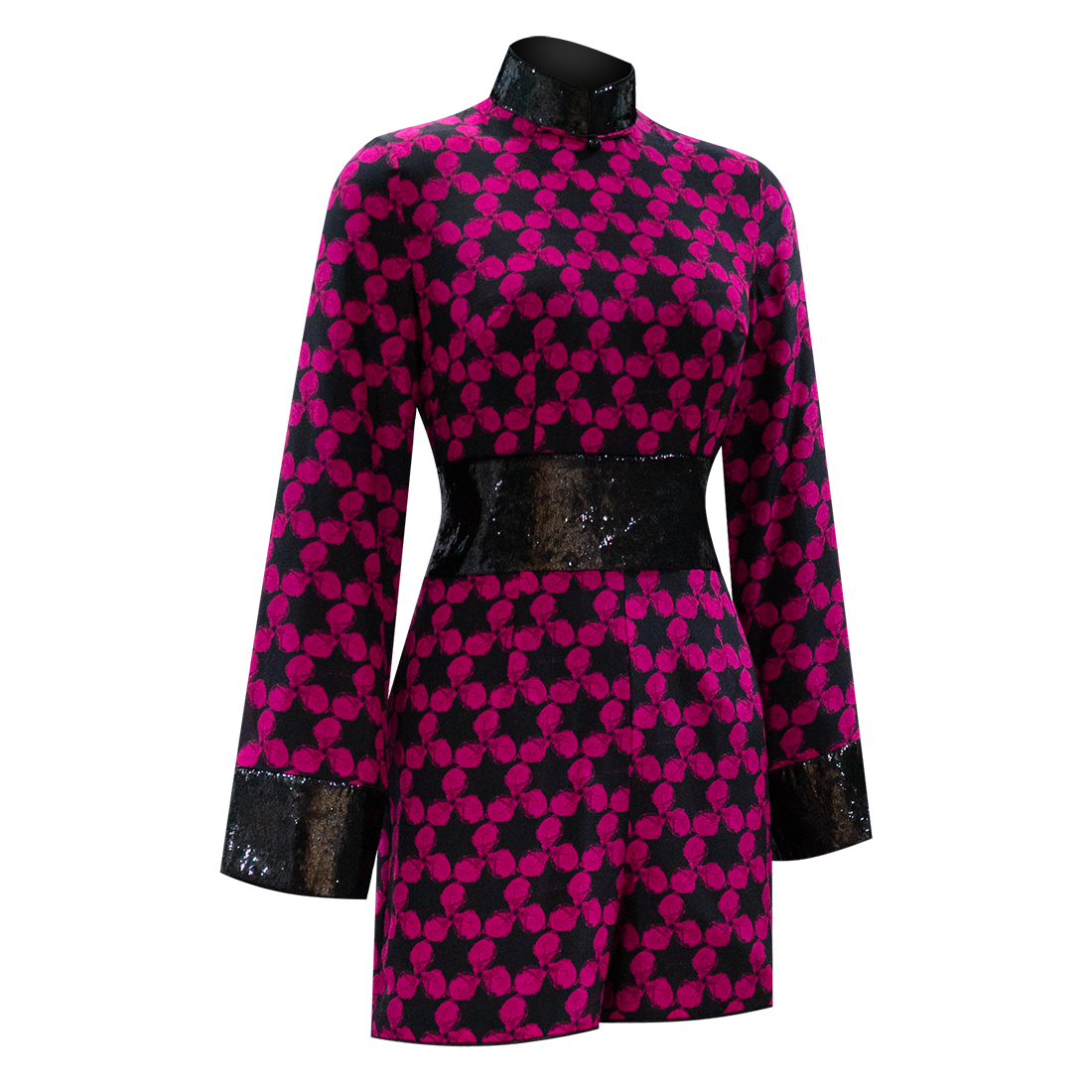 This jumpsuit is elegant yet sporty at the same time, made of pure silk printed in【PEACH OF IMMORTALITY】pattern inspired by HKMoA’s priceless antique Famille-Rose Overlay Glass 'Peach of Immortality' Snuff Bottle, and adorned with shimmery lurex mandarin collar, cuffs and waistline.