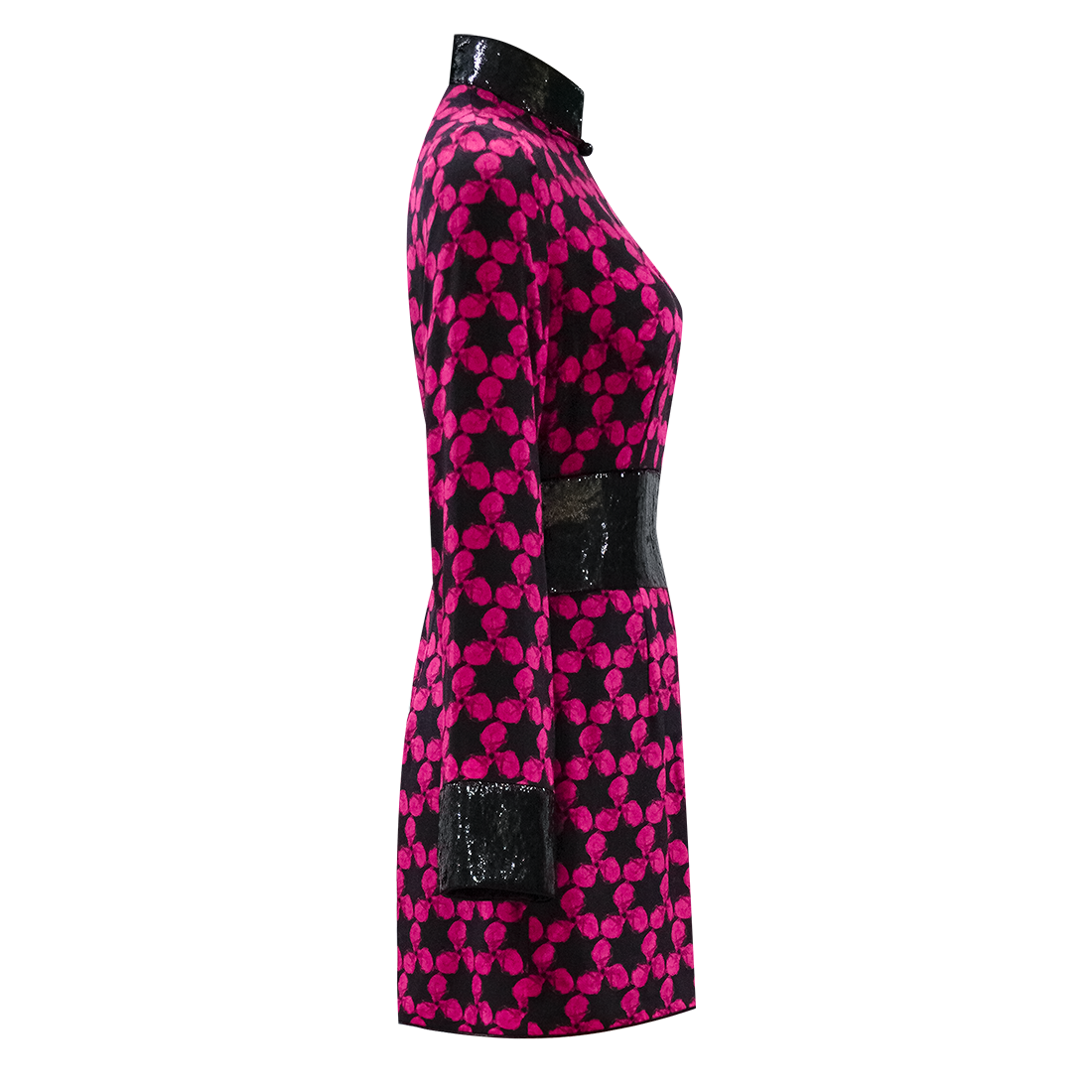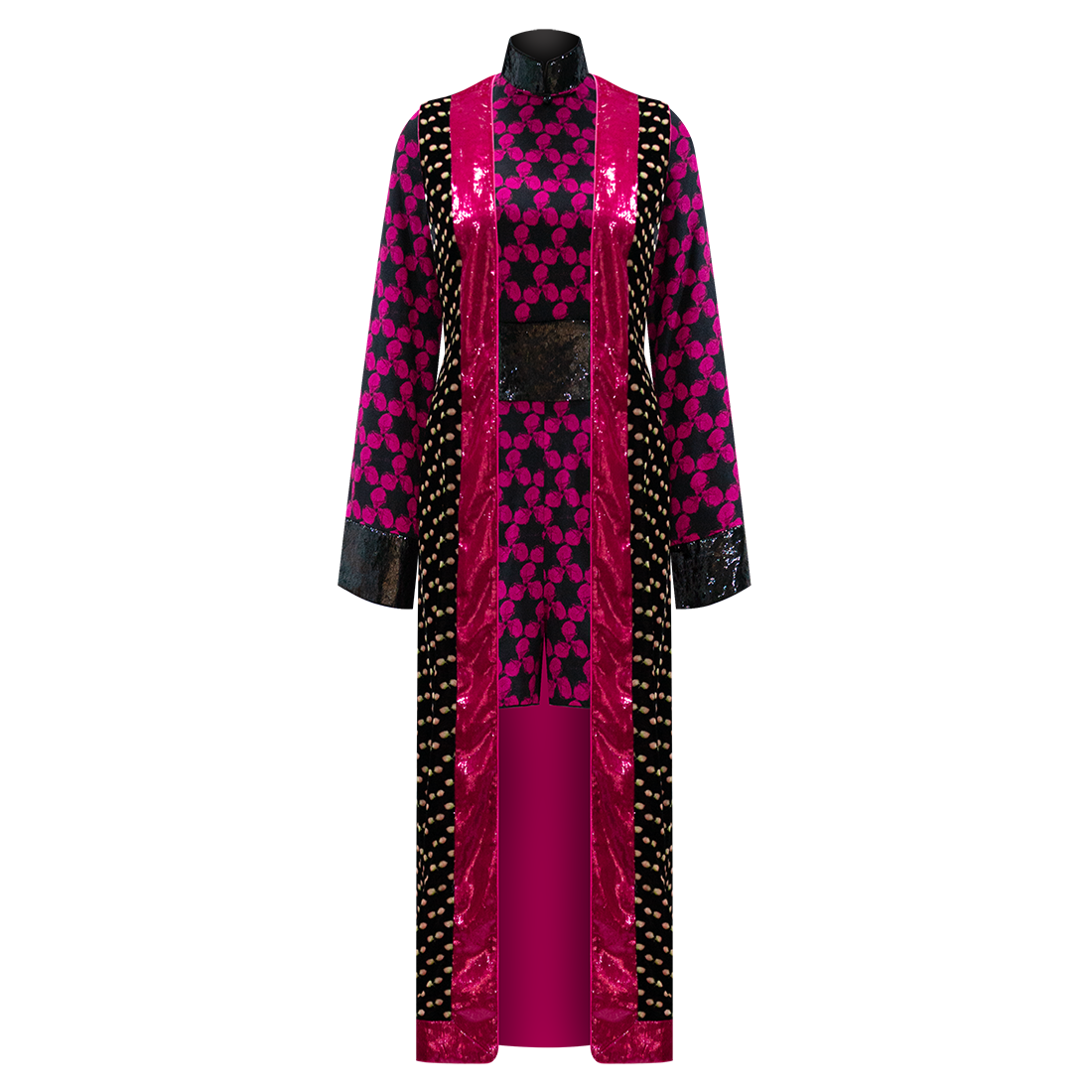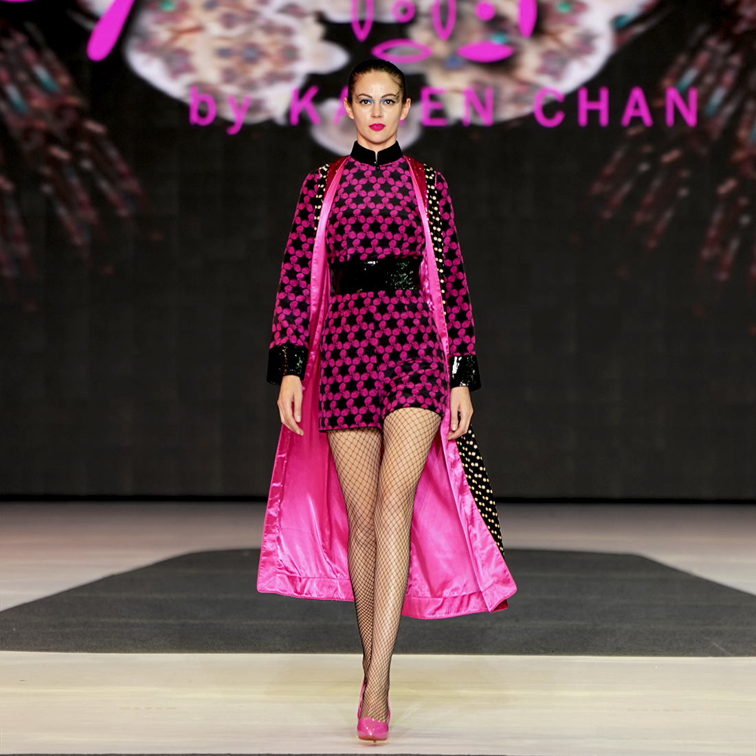 This jumpsuit is elegant yet sporty at the same time, made of pure silk printed in【PEACH OF IMMORTALITY】pattern inspired by HKMoA’s priceless antique Famille-Rose Overlay Glass 'Peach of Immortality' Snuff Bottle, and adorned with shimmery lurex mandarin collar, cuffs and waistline.