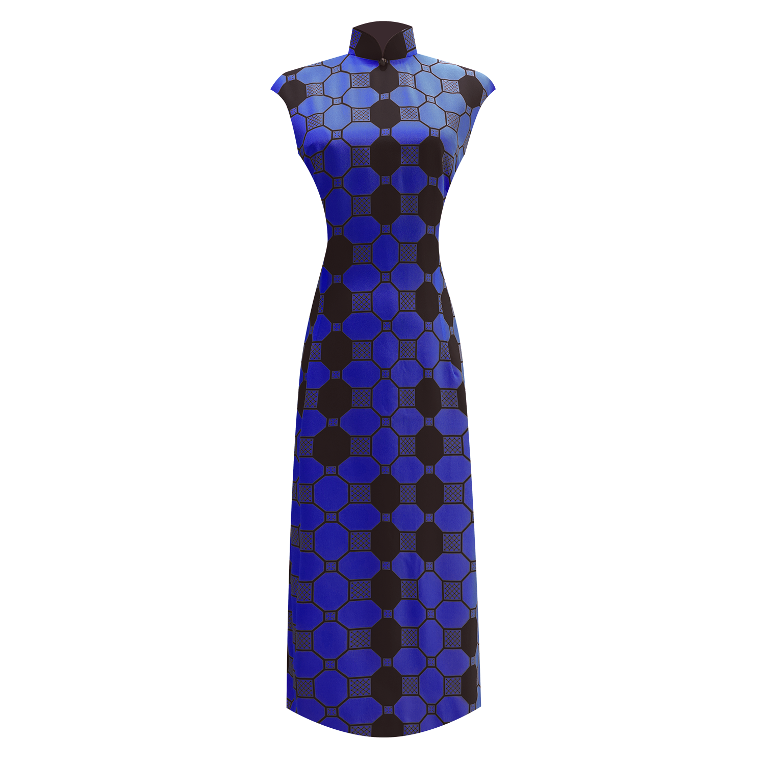 Blue & black retro tile pattern adds a stately charm to this 100% silk Cheongsam.