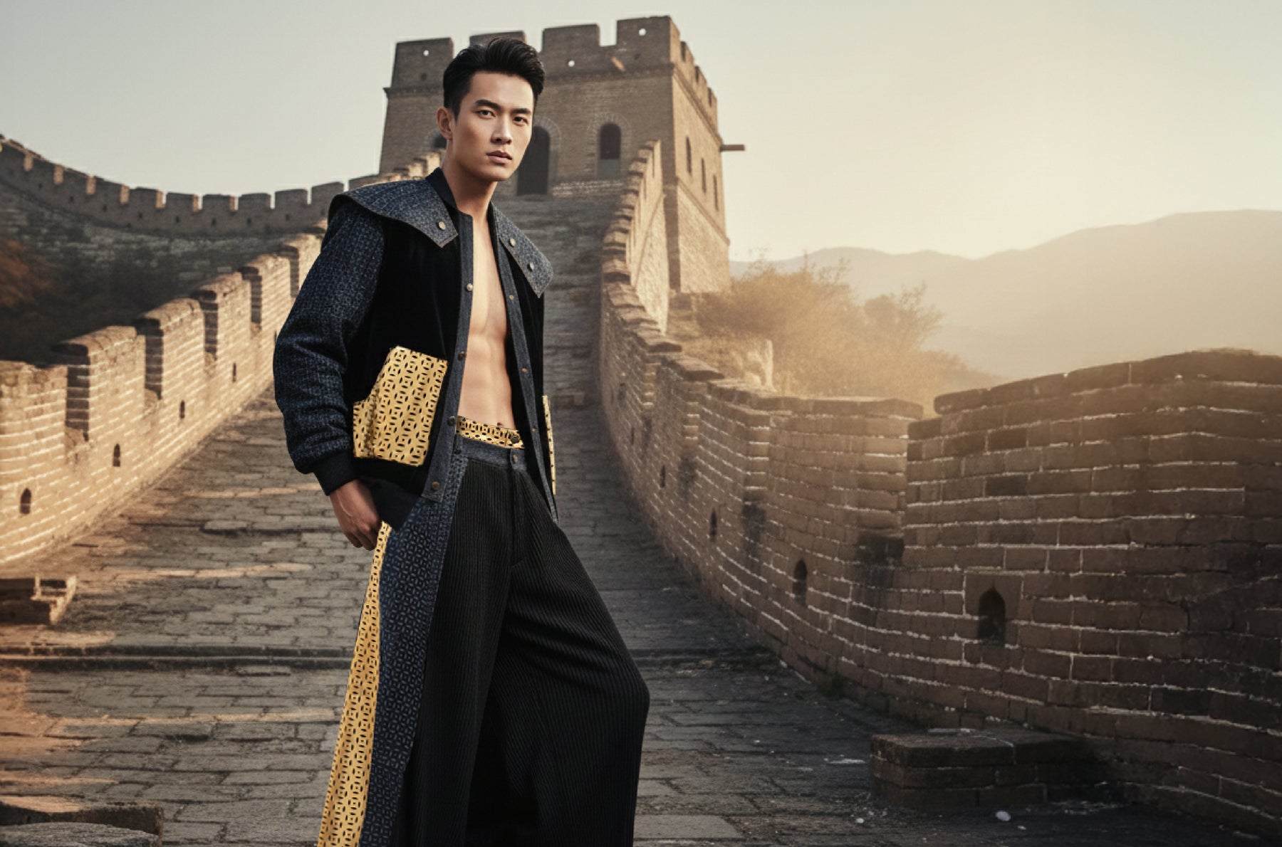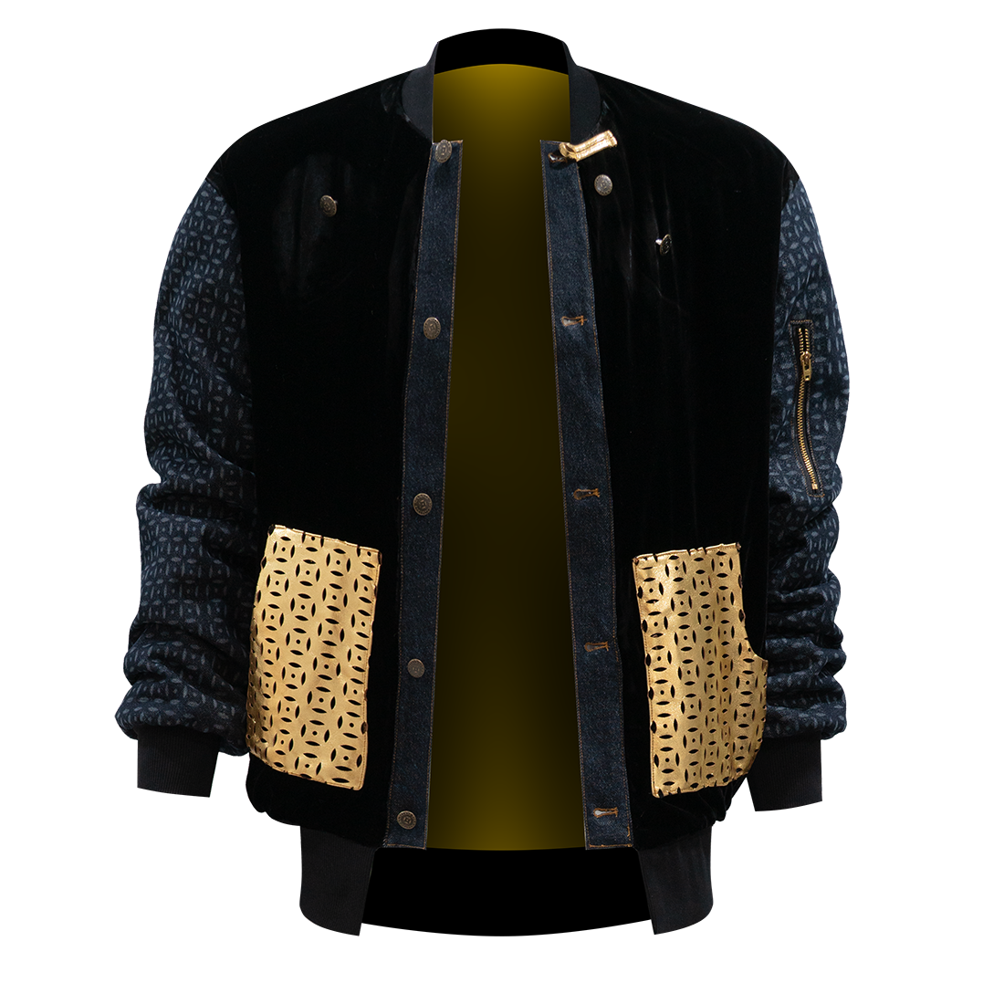 Stylish and sporty padded bomber jacket in black velvet, accentuated with pockets in this season’s ultra-hot signature【PROSPERITY COINS】pattern cutout gold lambskin, and sleeves in our brand signature【PROSPERITY COINS】patterned denim. 50% silk and 50% wool padding is plush and lightweight, perfect for cold winter days. Decorated with our Men’s version brand signature detachable Cape Collar Add-On for extra structure and pizazz.