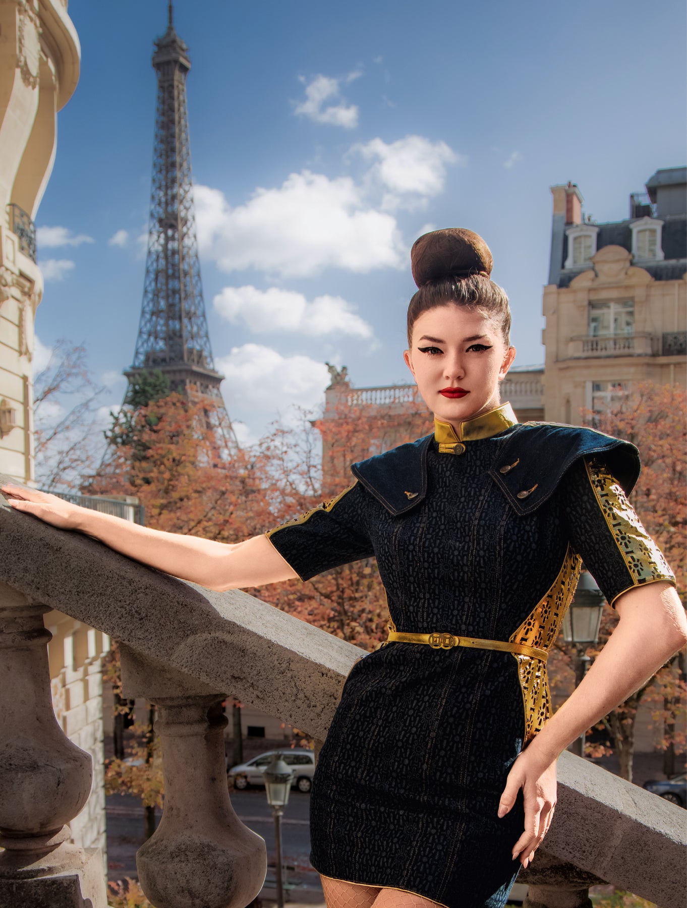 This ultra chic mini cheongsam is inspired by the movie “Back To The Past”. Black denim cheongsam with box shoulders and laser-printed with brand signature【STOREGATE】pattern and gold stitching radiates an action movie heroine vibe; brand signature gold lambskin mandarin collar and gold lambskin with【STOREGATE】pattern cutout on the sleeves and waistline add dimension and a luxurious feel to the piece. Brand signature detachable Cape Collar Add-On can be switched with other cape collar add-ons for a fresh look everyday.