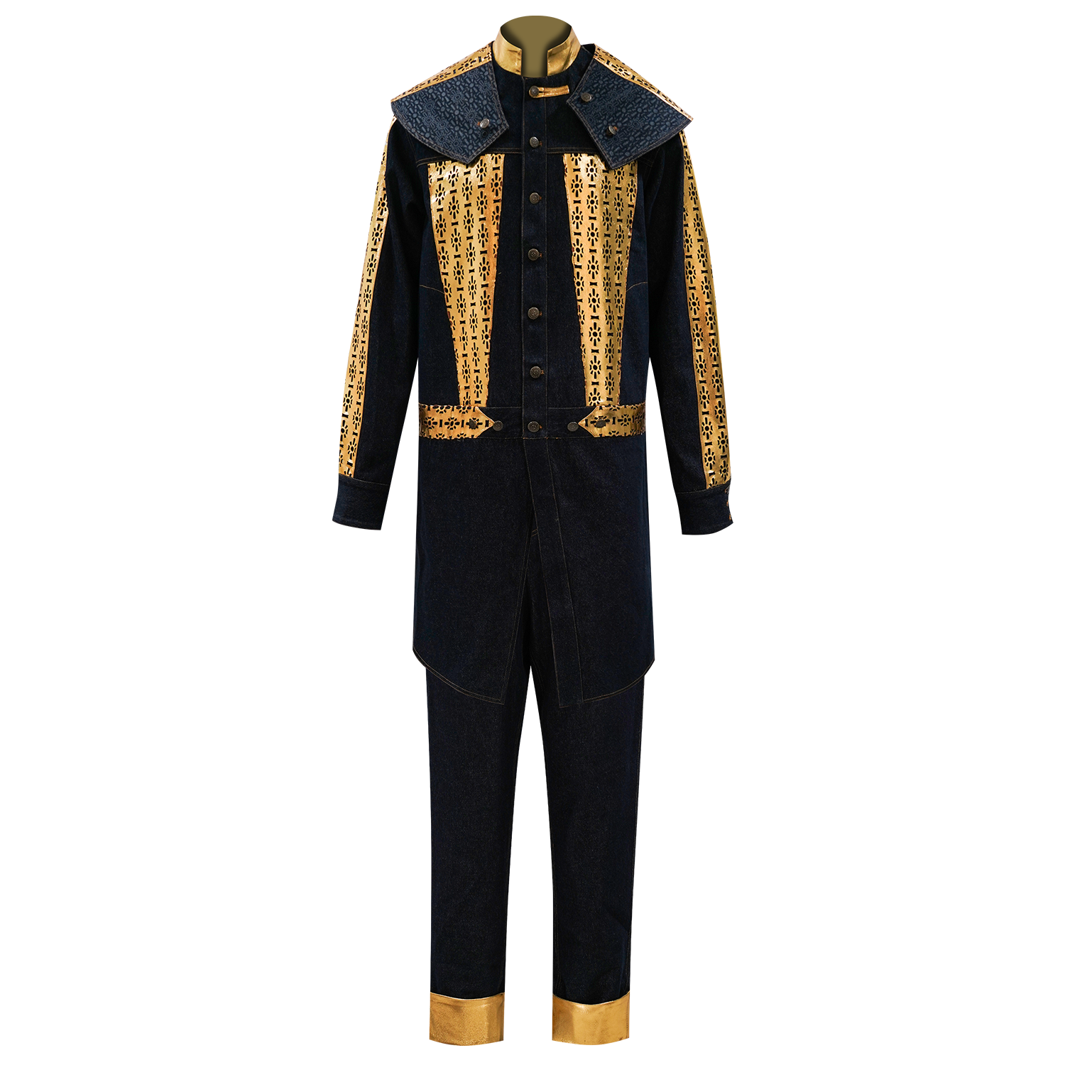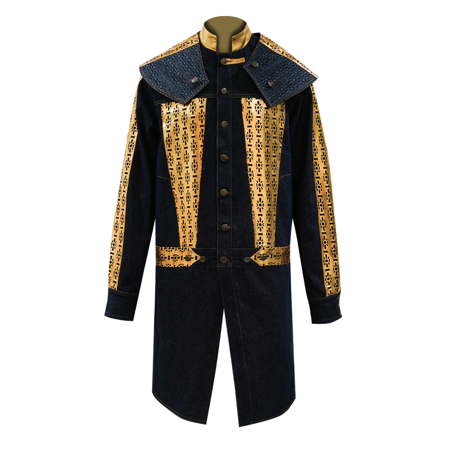 Men’s indigo denim overcoat with our brand signature gold lambskin mandarin collar. Backpiece is denim laser-printed with brand signature【STOREGATE】pattern; the front, sleeves and waistline are accentuated with this season’s ultra-hot signature gold lambskin【STOREGATE】pattern cutout. Decorated with our Men’s version brand signature detachable Cape Collar Add-On for extra structure and pizazz.