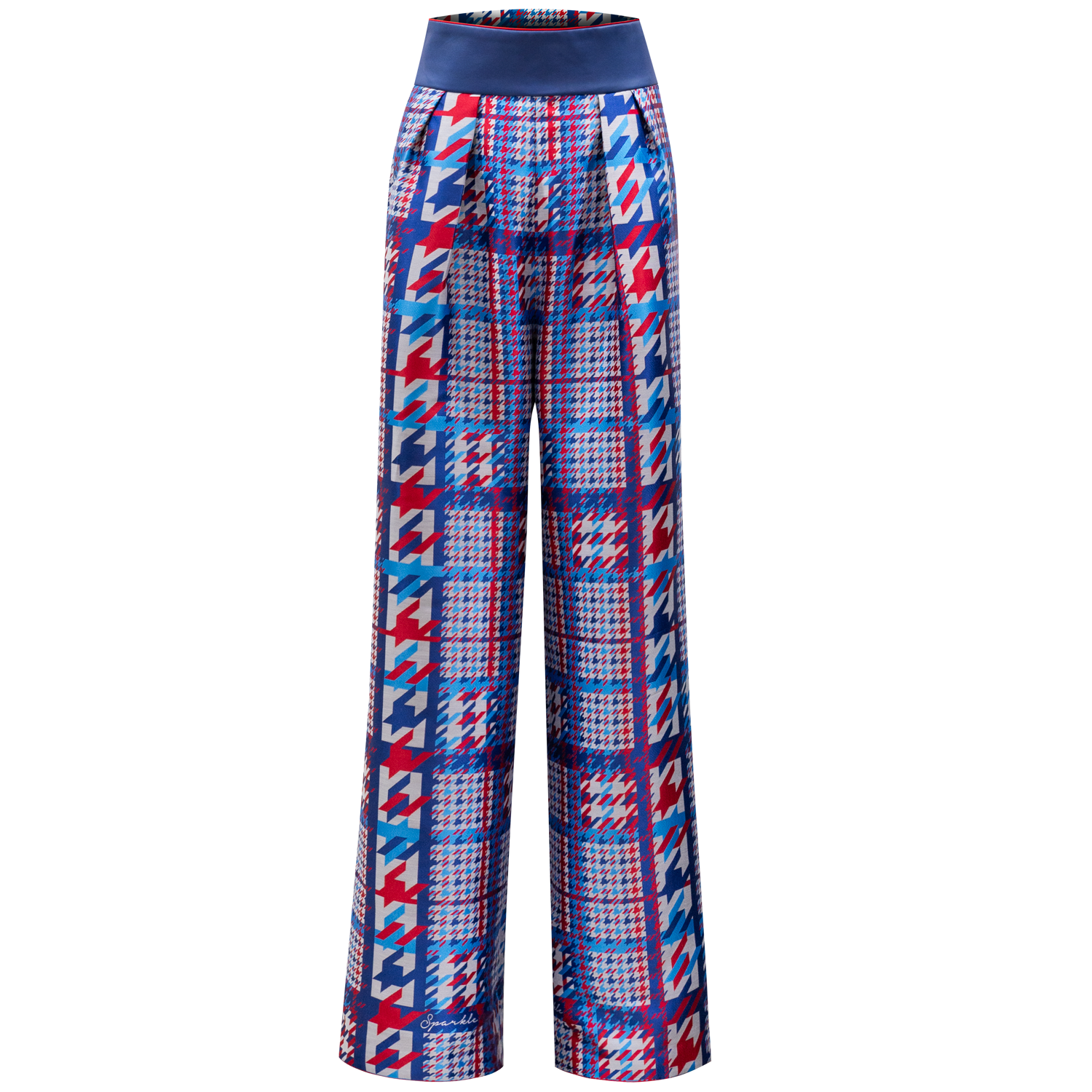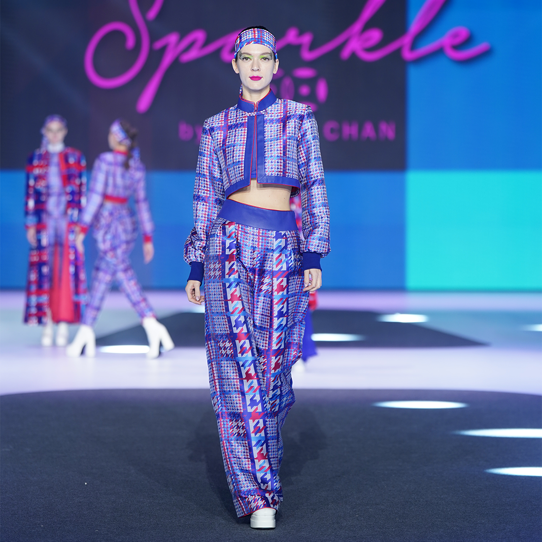Brocade pants pleated at the waistline, with matching large HOUNDSTOOTH pattern on both pant legs’ outer sides, together with the slight bootleg cutting, elongate the silhouette and create a slimming effect.
