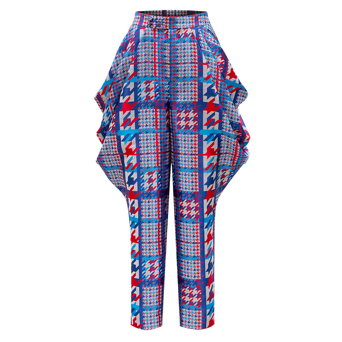 These chic and trendsetting baggy harem pants are made of brocade knit in our brand signature red-white-blue color palette symbolic of the HK Spirit. Chinese knot buttons at the waistband add a touch of authentic cheongsam element to the piece.