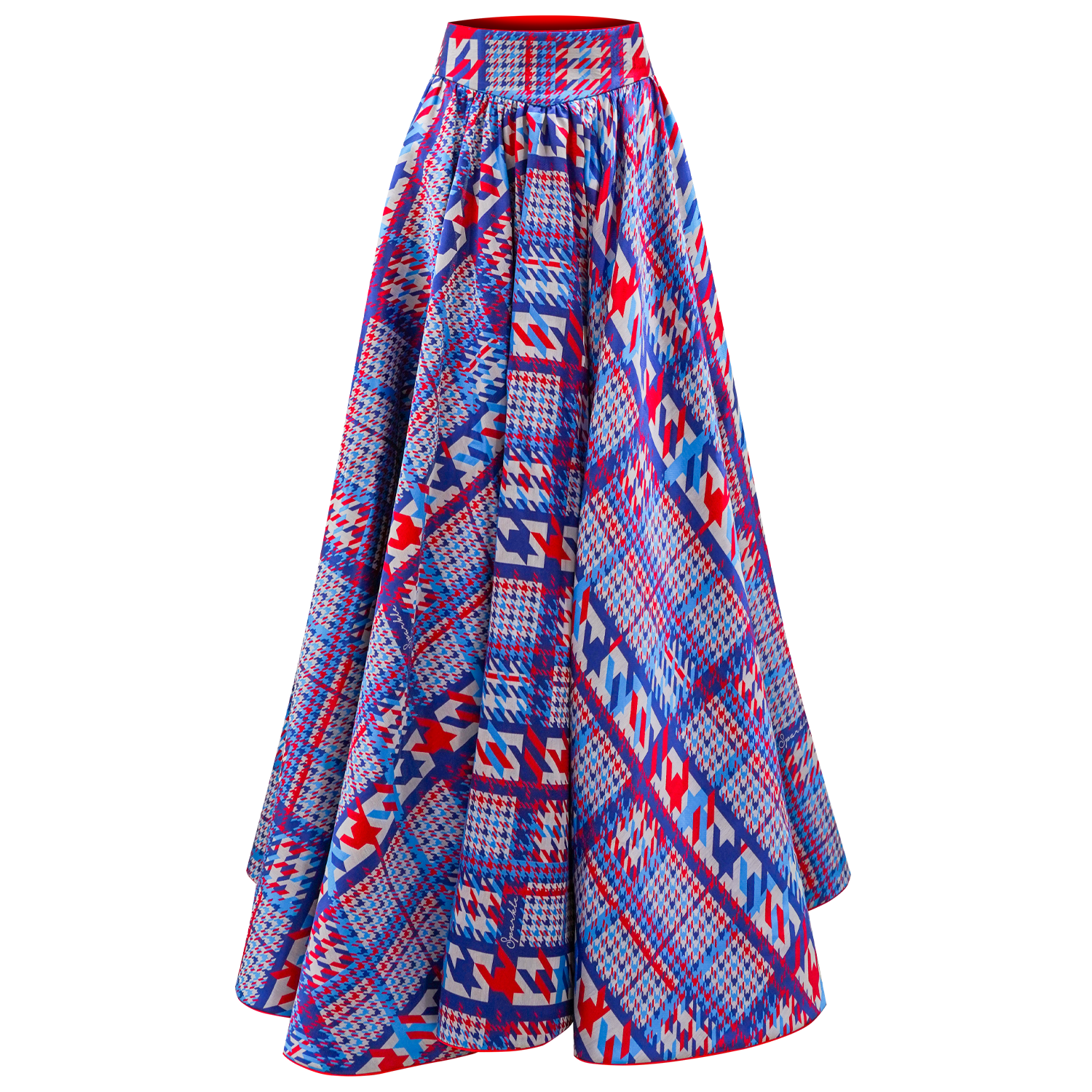 This ankle length brocade skirt with a high side slit and gathered waistline is sexy and feminine; the red silk acetate lining creates a peekaboo effect and extra dimension to the piece.