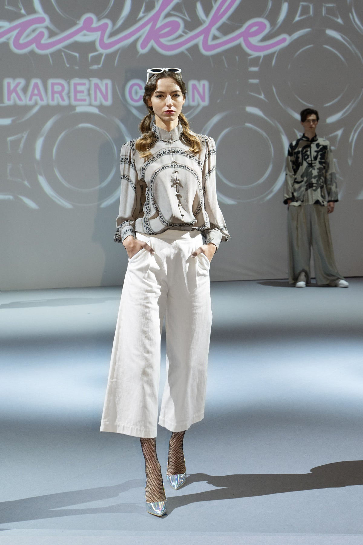 100% silk tang blouse in a grey rings and diamonds pattern reminiscent of tiles popular in HK in the 1950-60’s. Fine Austrian crystal knot button adds an sophisticated sparkle to this retro jacket.