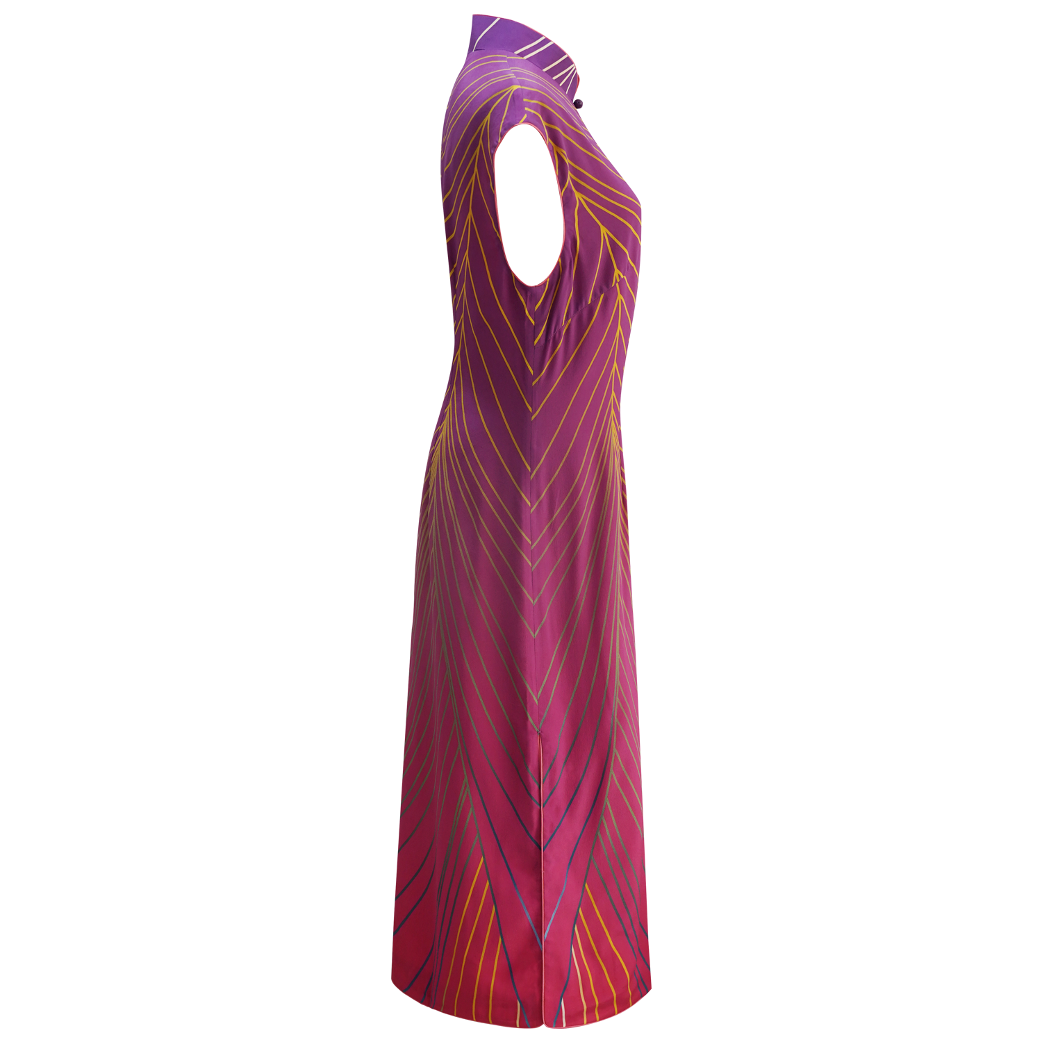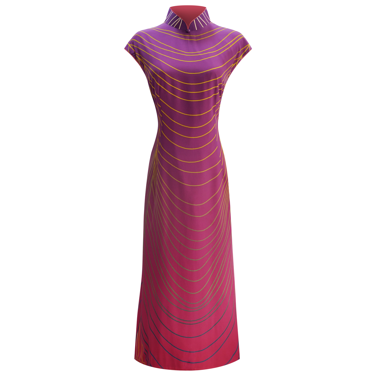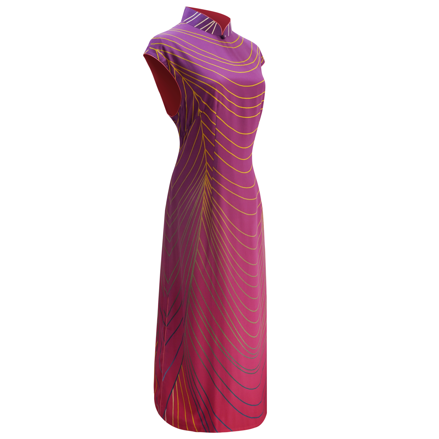 Renowned designer Natalia Khaw designed this fabric pattern inspired by dripping crystal chandeliers that graced almost every HK home back in the 90’s. Neon orange and fuchsia strands set against Purple silk, paired with our season-signature leather Mandarin collar in black and a high side-slit, this cheongsam is elegant, sexy, and fit for any grand occasion.