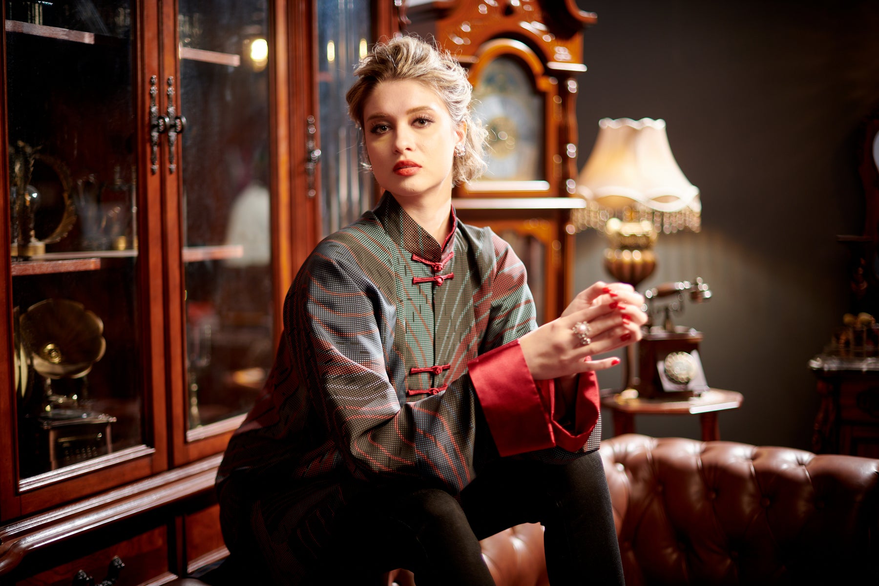 For silk cheongsams and Tang jackets, upgrade to leather Mandarin collar is available at $1500 upon customer’s request.
