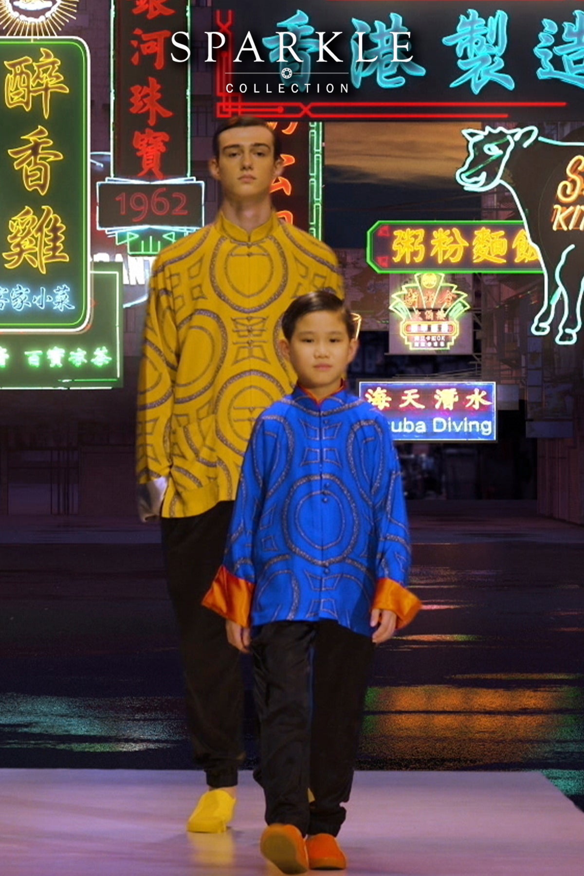 The rings and diamonds pattern are reminiscent of tiles popular in HK in the 1950-60’s. Gold colored silk offset with silver collar trim and cuffs give off a dash of debonairness.