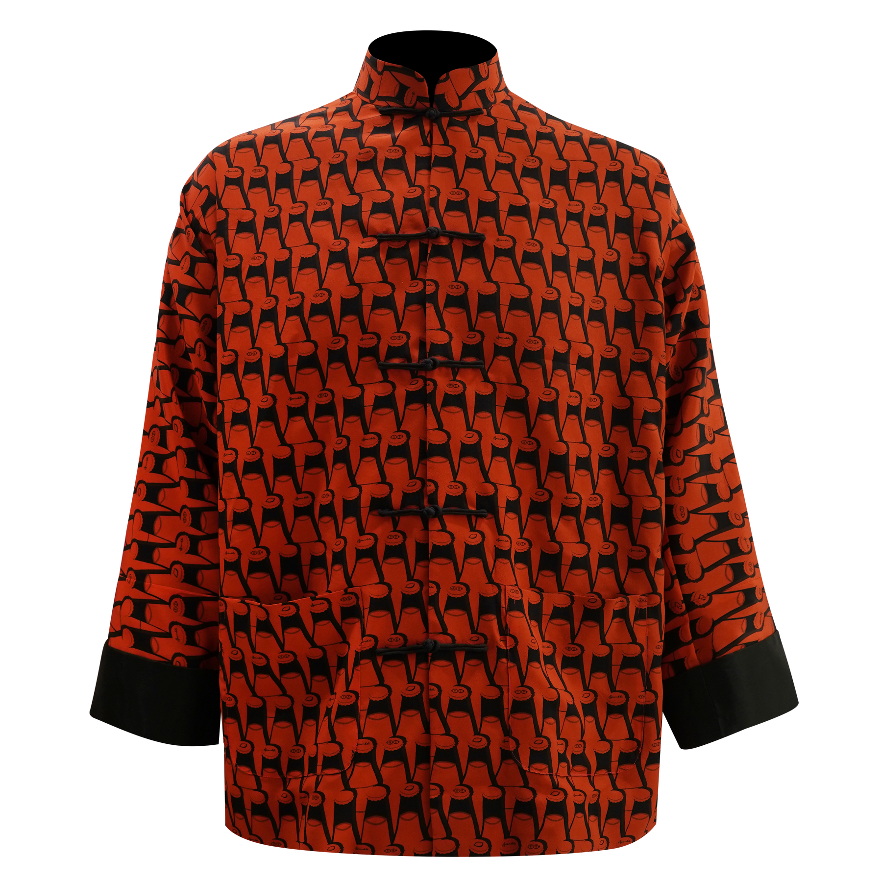 Red and black soda bottle that give off a steampunk feel, together with the black lambskin Mandarin Collar and satin cuffs give this funky Tang jacket a rock star appeal.