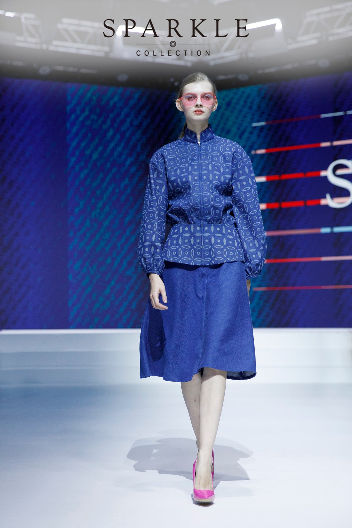 Sweet indigo denim zip-up jacket with laser-takeout of our signature iconic “Prosperity Coin” pattern, paired together with indigo hemp-denim midi skirt, this ensemble is the epitome of femininity.
