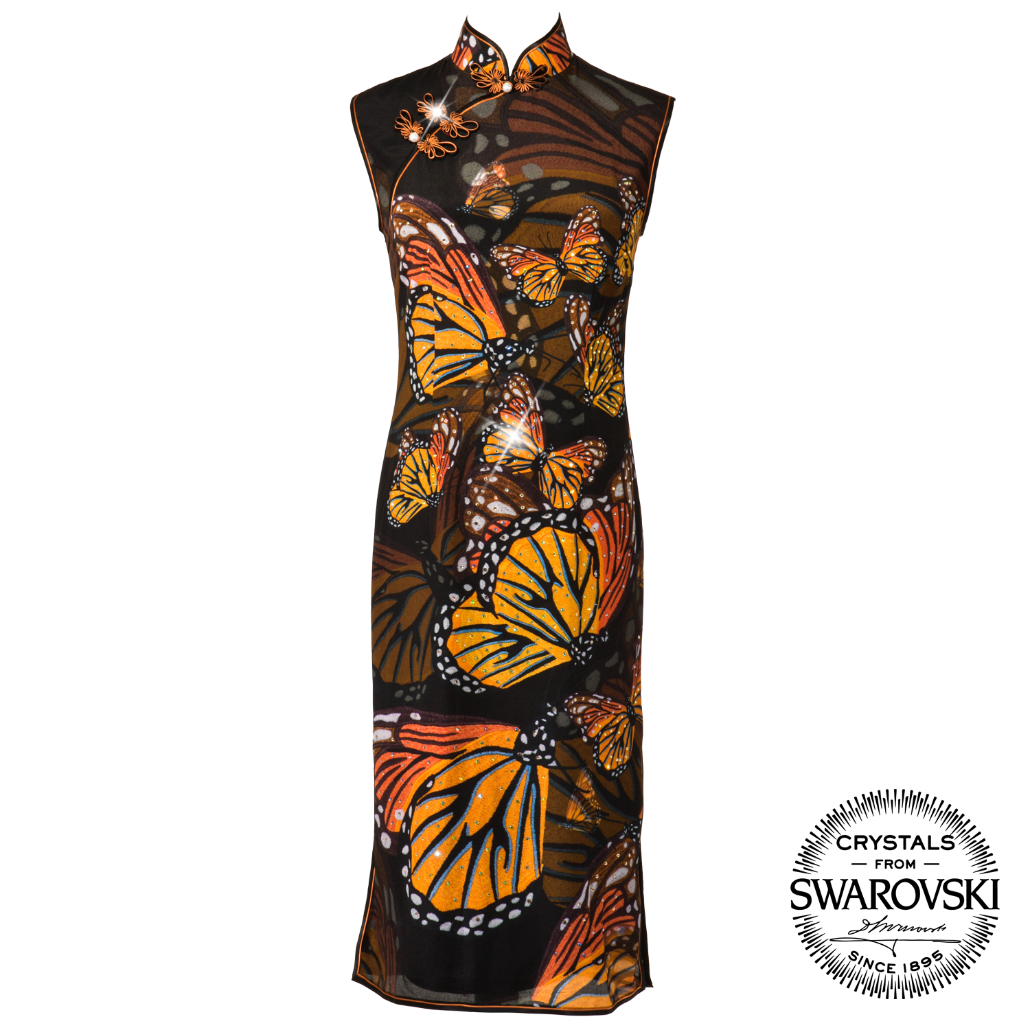 The Monarch Butterfly Collection Cheongsams come in 3 different butterfly prints. In the 1st design, the prominent butterflies are small, with large butterfly silhouettes hazily fluttering in the background; the 2nd design shows butterflies of different sizes flittering about in camaraderie; and in the 3rd design, the butterflies are the most vibrant and eye-catching.