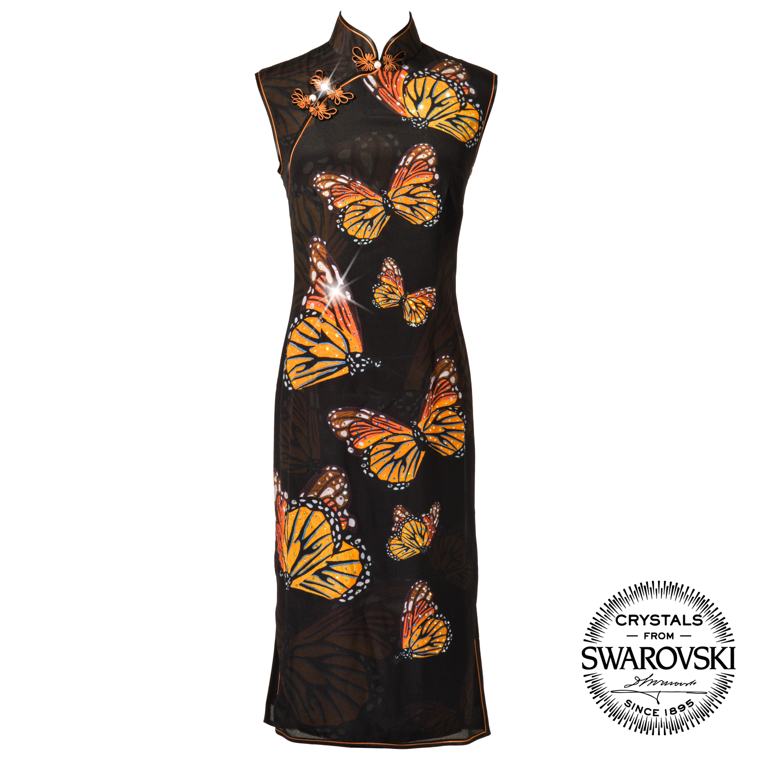 The Monarch Butterfly Collection Cheongsams come in 3 different butterfly prints. In the 1st design, the prominent butterflies are small, with large butterfly silhouettes hazily fluttering in the background; the 2nd design shows butterflies of different sizes flittering about in camaraderie; and in the 3rd design, the butterflies are the most vibrant and eye-catching.