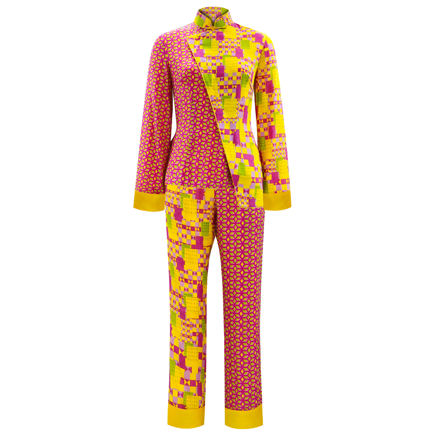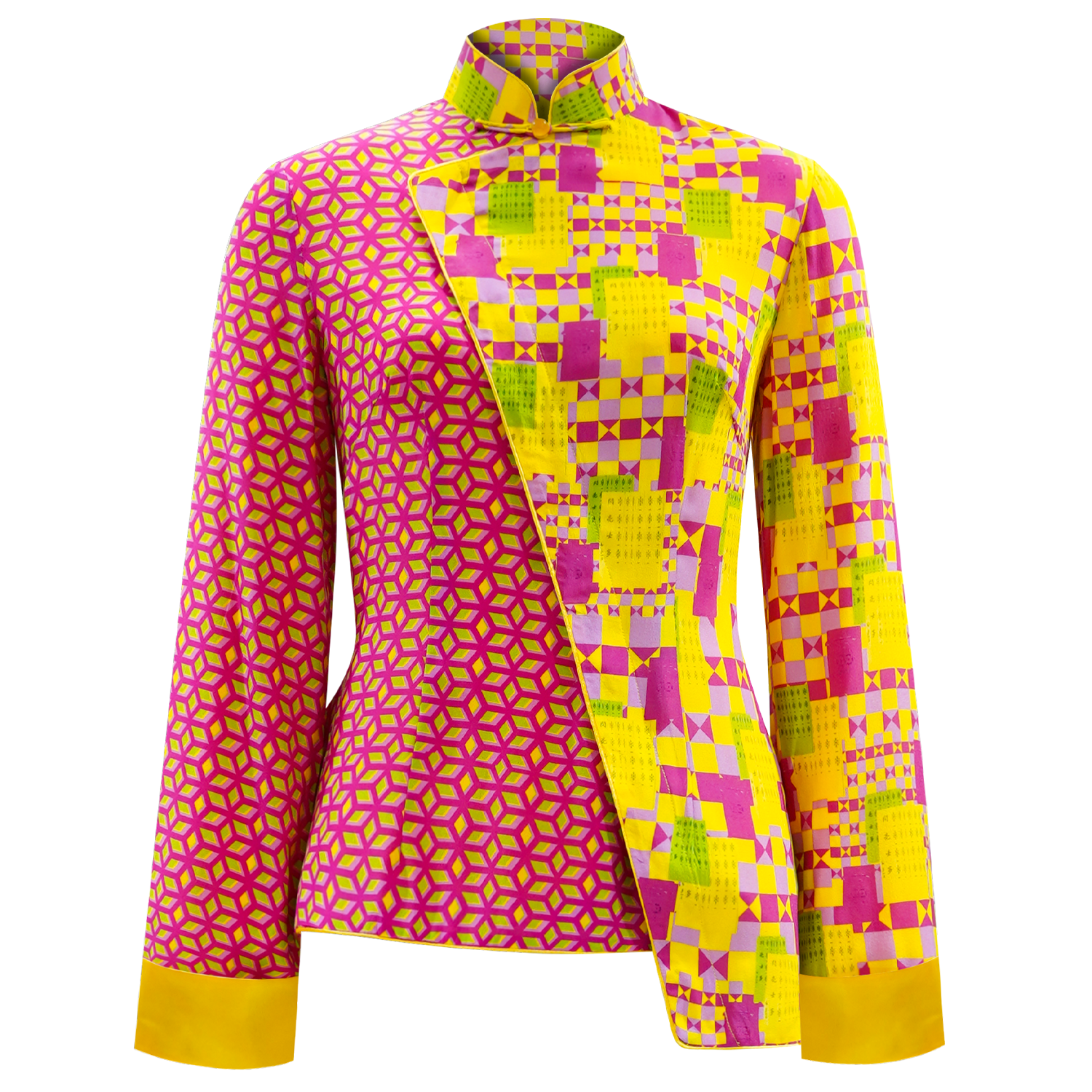 This whimsical yin-yang mini Tang jacket / kung fu jacket is inspired by our original【GALVINISED IRON】pattern featuring old store gates and mailboxes on display in the Hong Kong Heritage Museum, and also listed on the Hong Kong Intangible Cultural Heritage Office’s ICH representative list under “Galvinised Iron Product Making Technique”, matched with【ANTIQUITY WINDOW】pattern inspired by the latticework of antiquity windows (漏窗) found within the Sam Tung Uk Museum’s architectural structure.