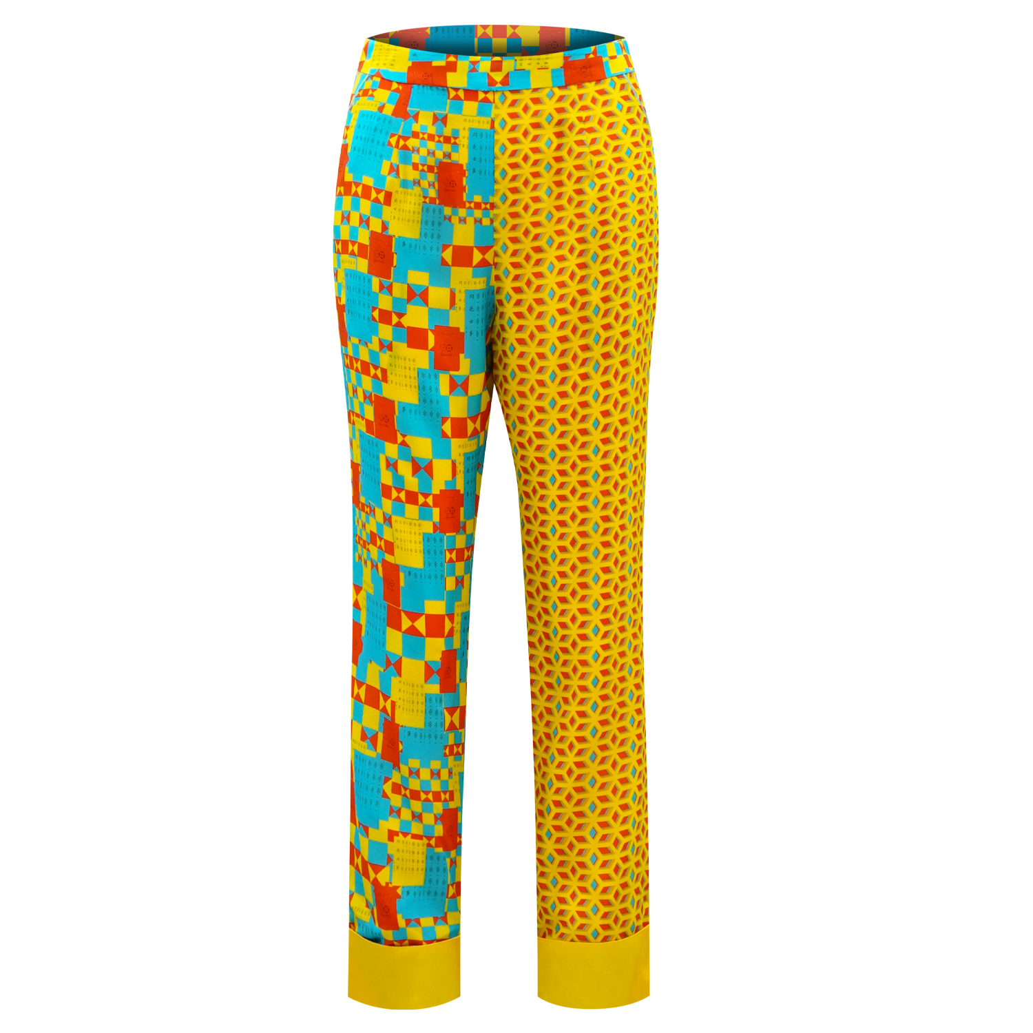 This whimsical yin-yang straight legged trousers / Kung Fu pants are inspired by our original【GALVINISED IRON】pattern featuring old store gates and mailboxes on display in the Hong Kong Heritage Museum, and also listed on the Hong Kong Intangible Cultural Heritage Office’s ICH representative list under “Galvinised Iron Product Making Technique”, matched with【ANTIQUITY WINDOW】pattern inspired by the latticework of antiquity windows (漏窗) found within the Sam Tung Uk Museum’s architectural structure.