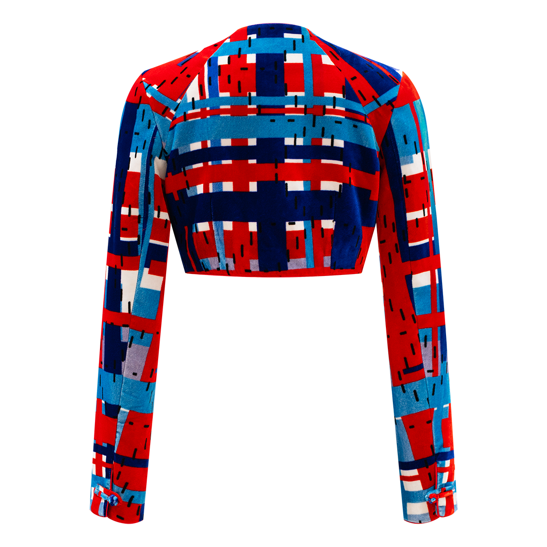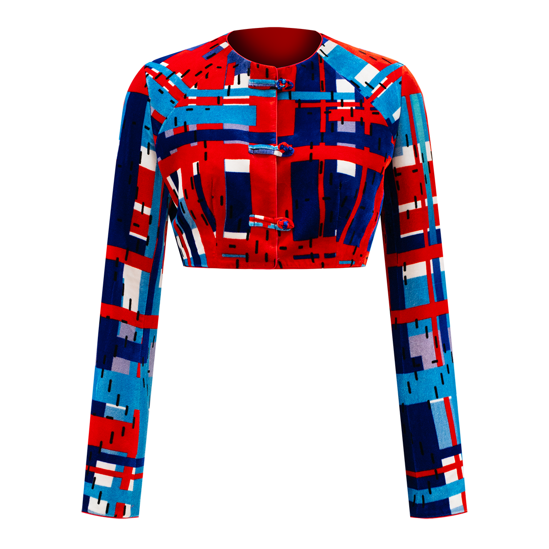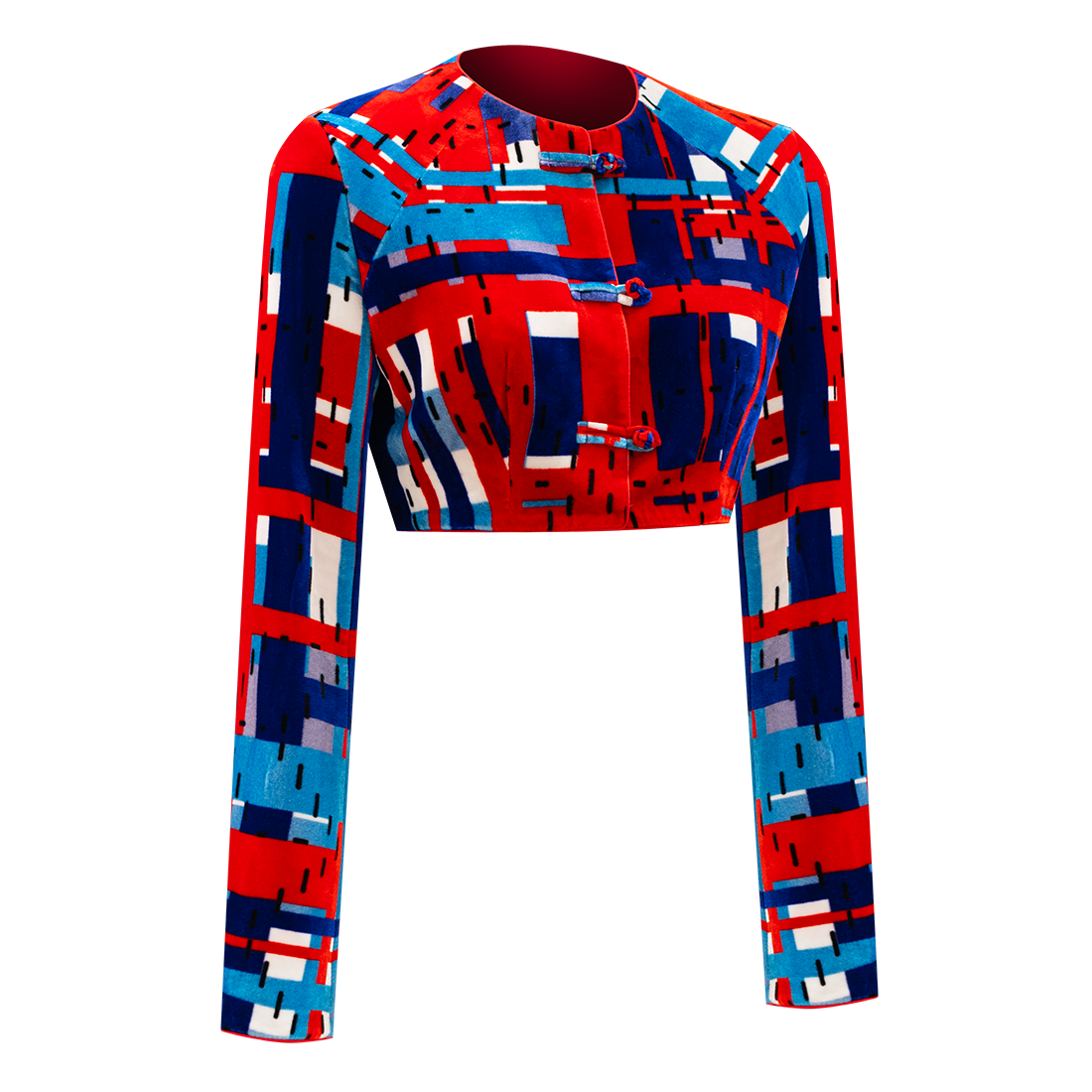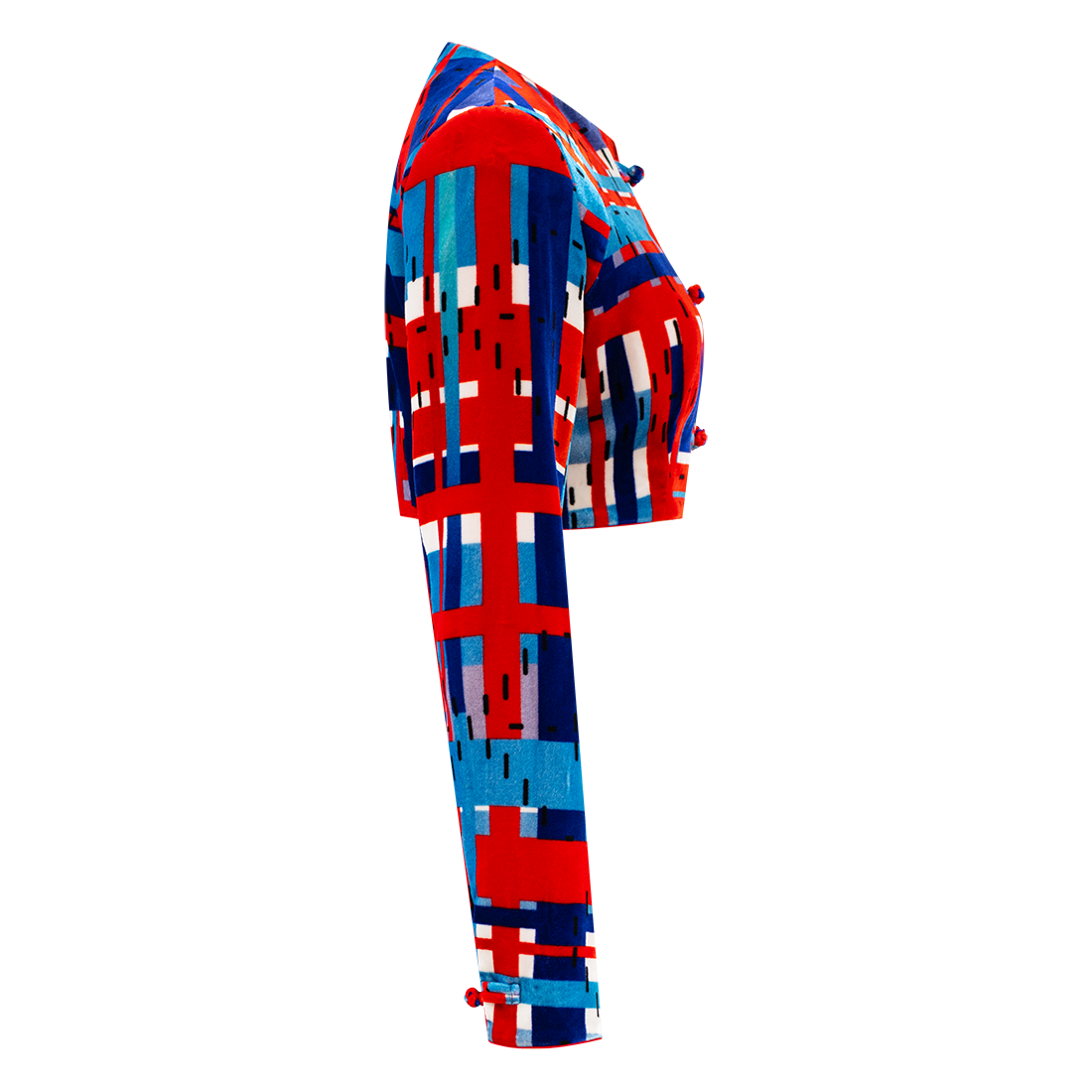 Chic cropped jacket in luscious velvet, with jewel neckline adorned with 3 rows of Chinese knot buttons, and Chinese knot buttons at the cuffs.