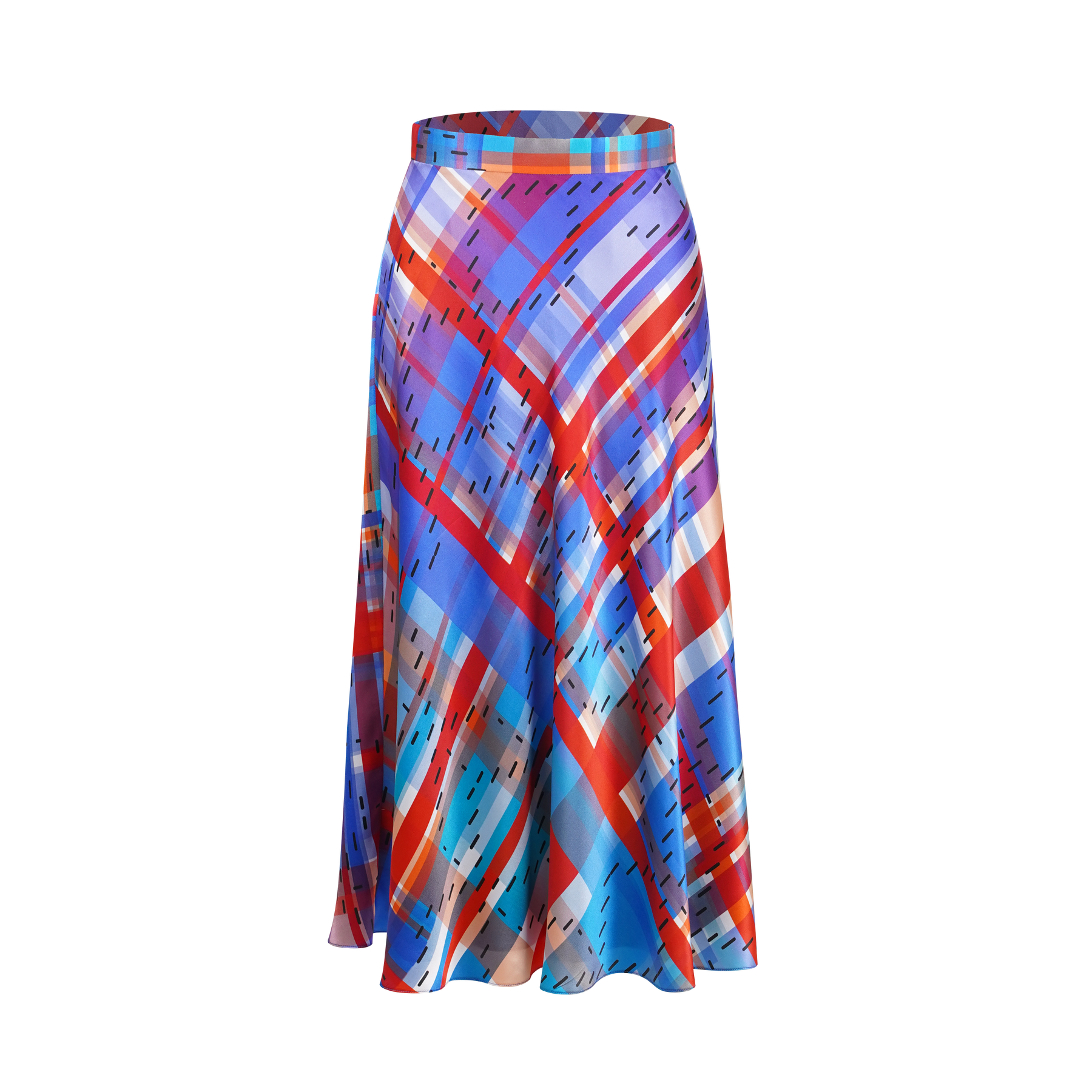 Flowing midi skirt in our iconic HK red, white and blue checker tarp pattern satin.