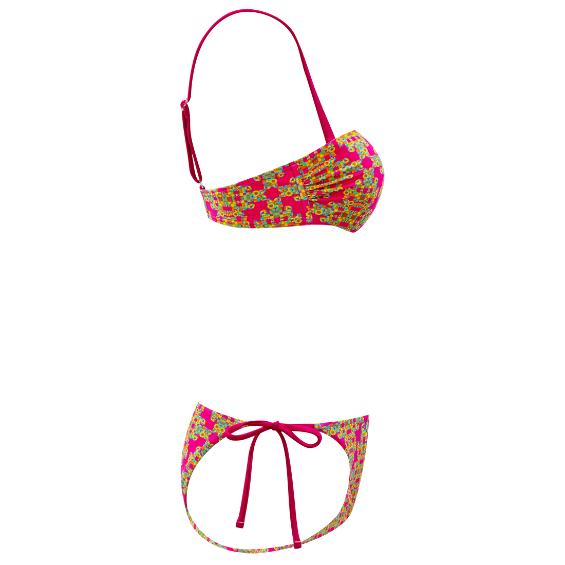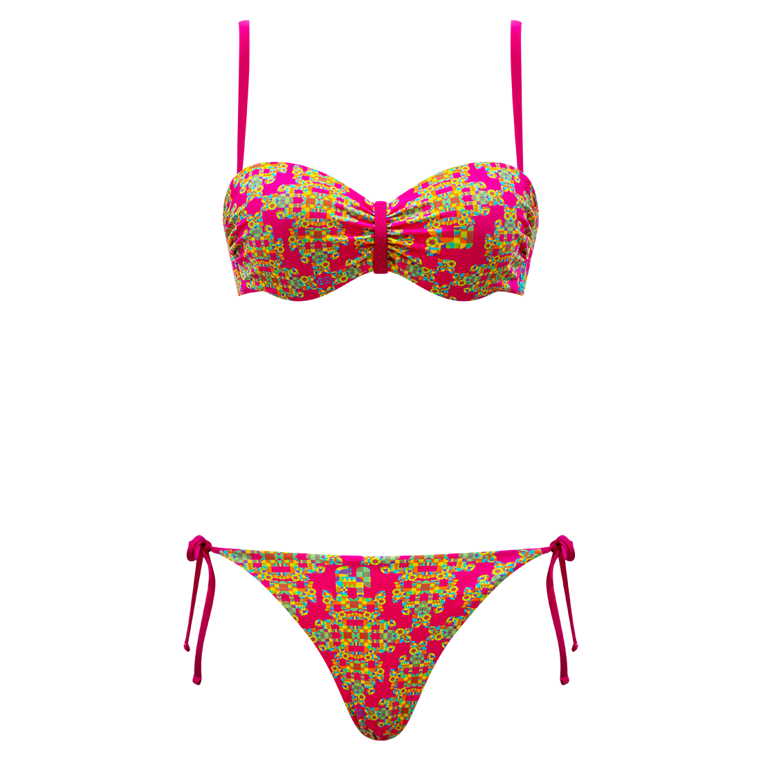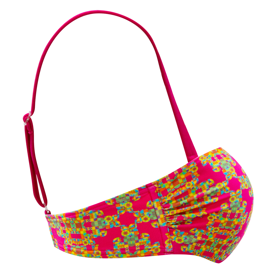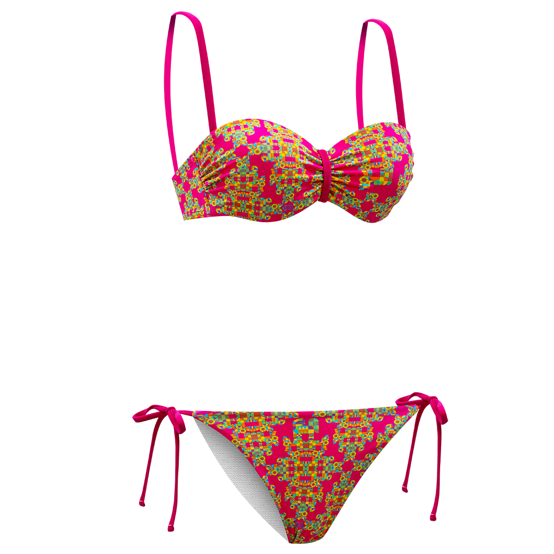 Strapless bandeau style bikini in fuchsia adorned with kaleidoscopic horses