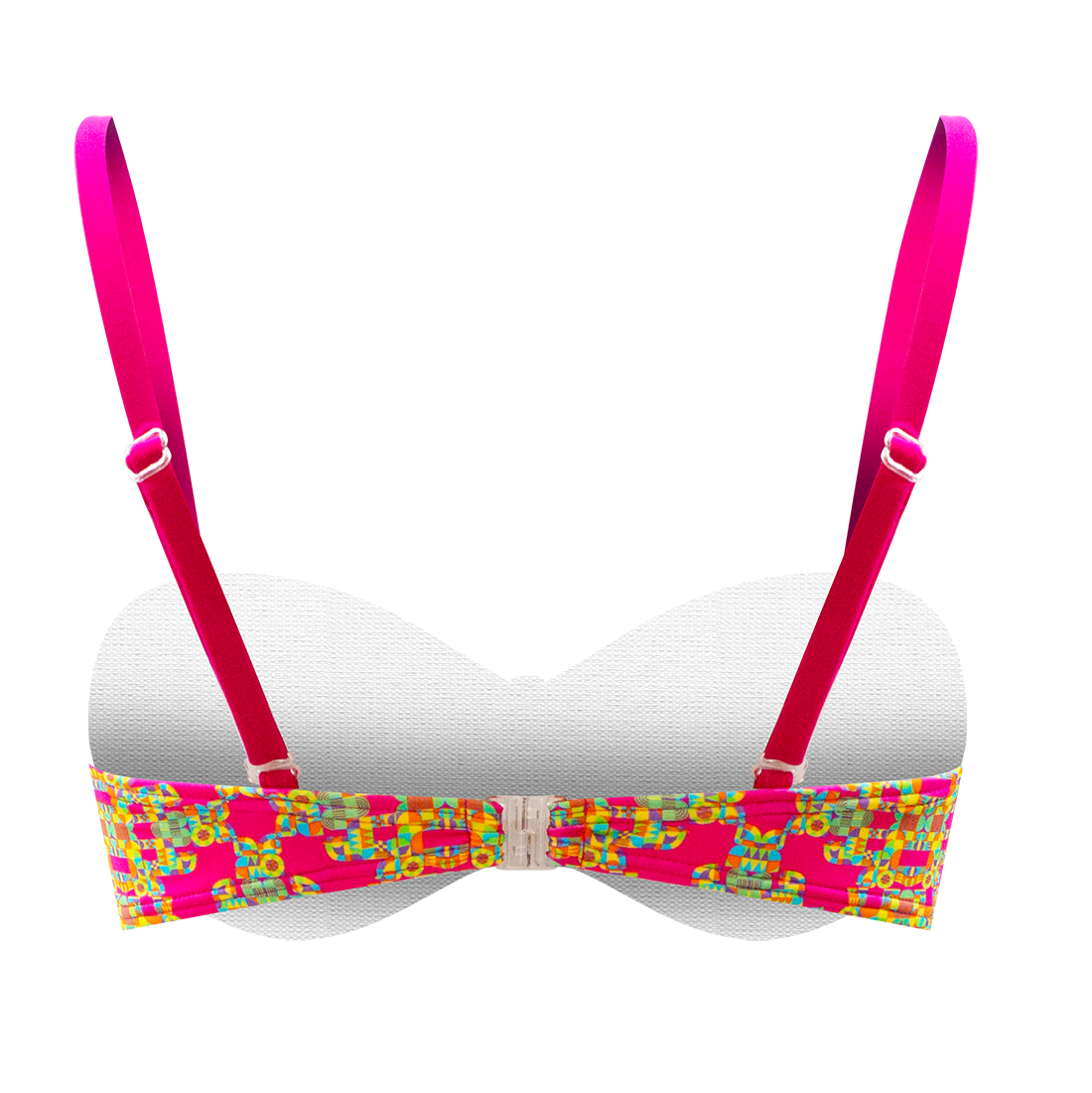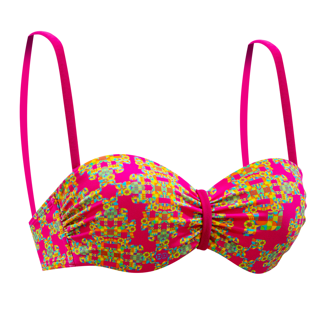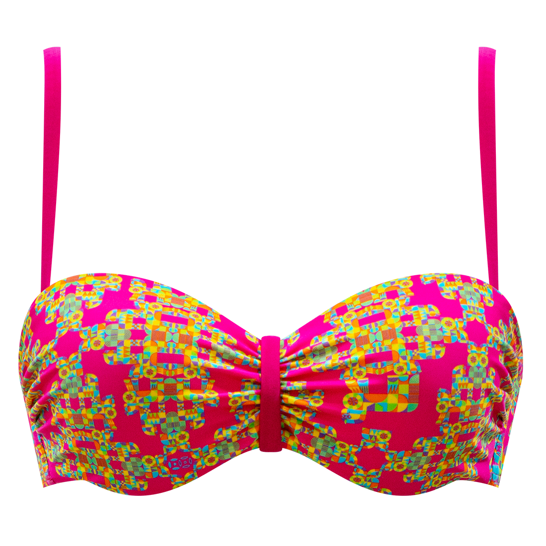 Strapless bandeau style bikini in fuchsia adorned with kaleidoscopic horses