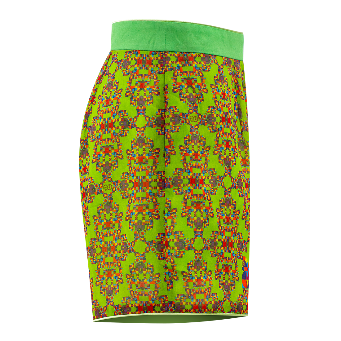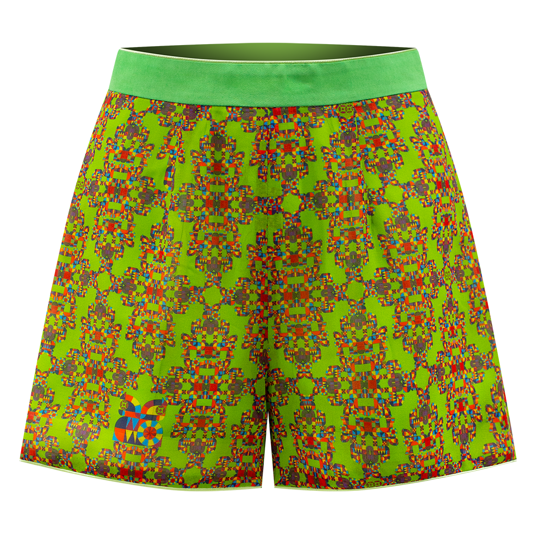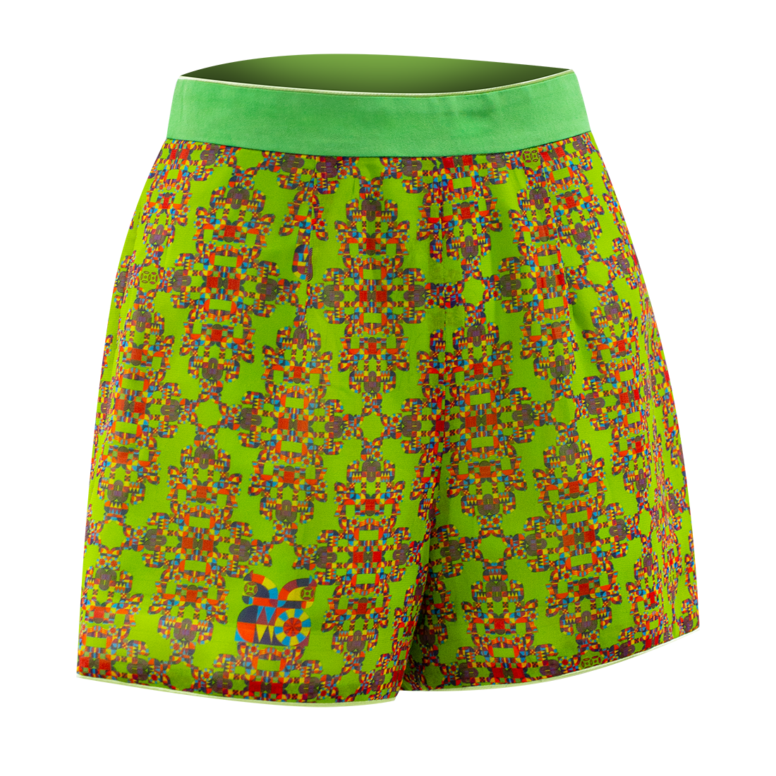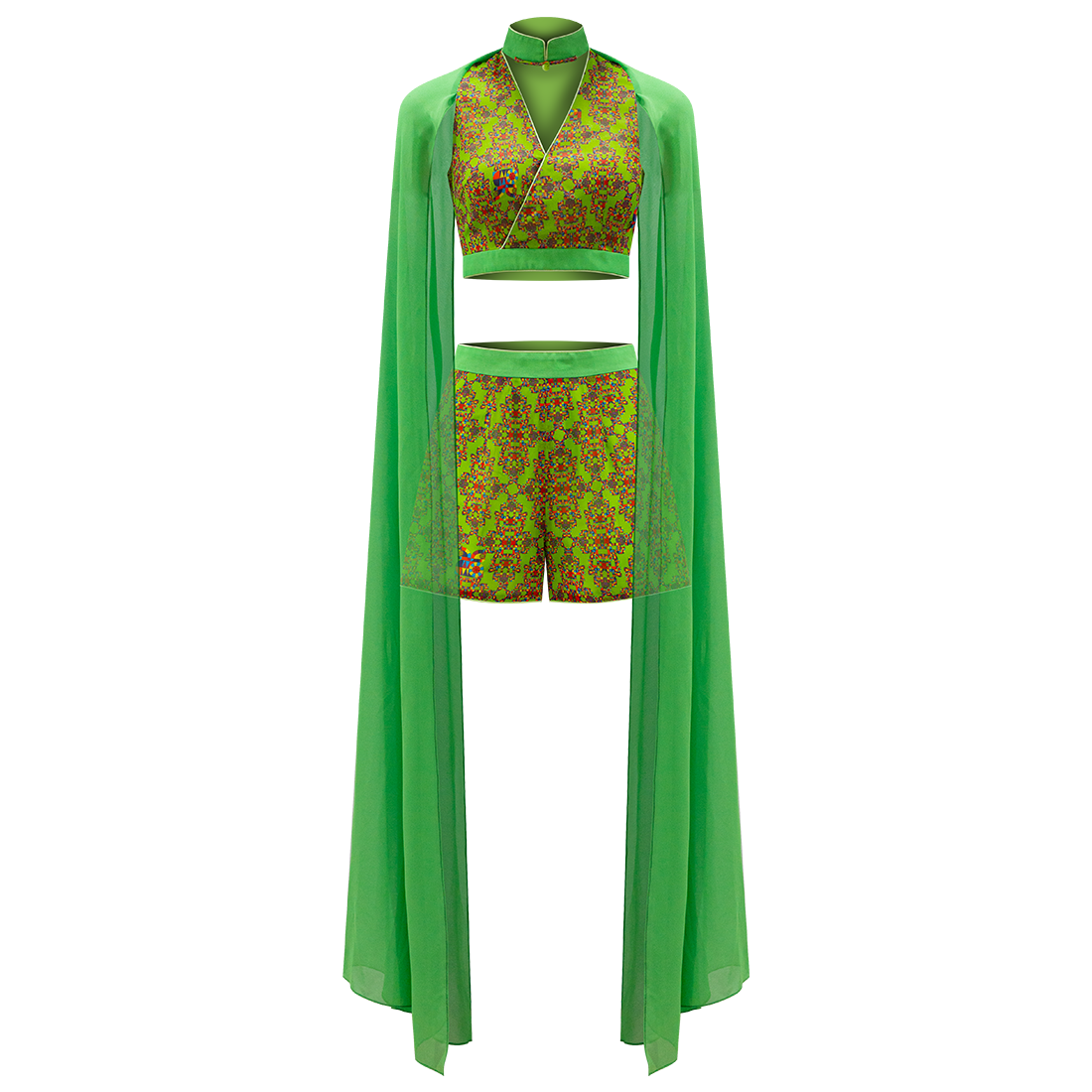 Printed chiffon hot pants with neon lime green chiffon waistline lined in satin. High waistline is inspired by 1950’s Marilyn Monroe’s style beachwear, and long sheer chiffon sash inspired by Cantonese opera’s water sleeves.
