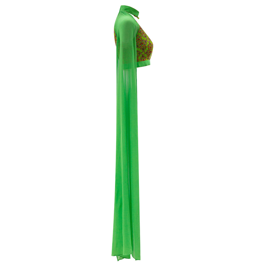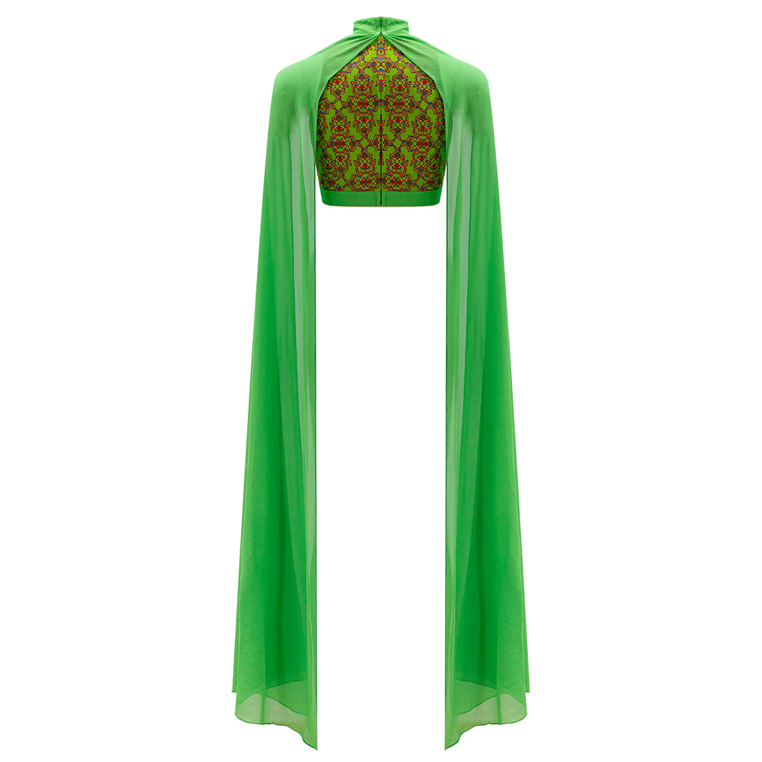 Printed chiffon halter-neck cheongsam cropped top with brand Mandarin collar in a matching neon lime green chiffon with satin lining.