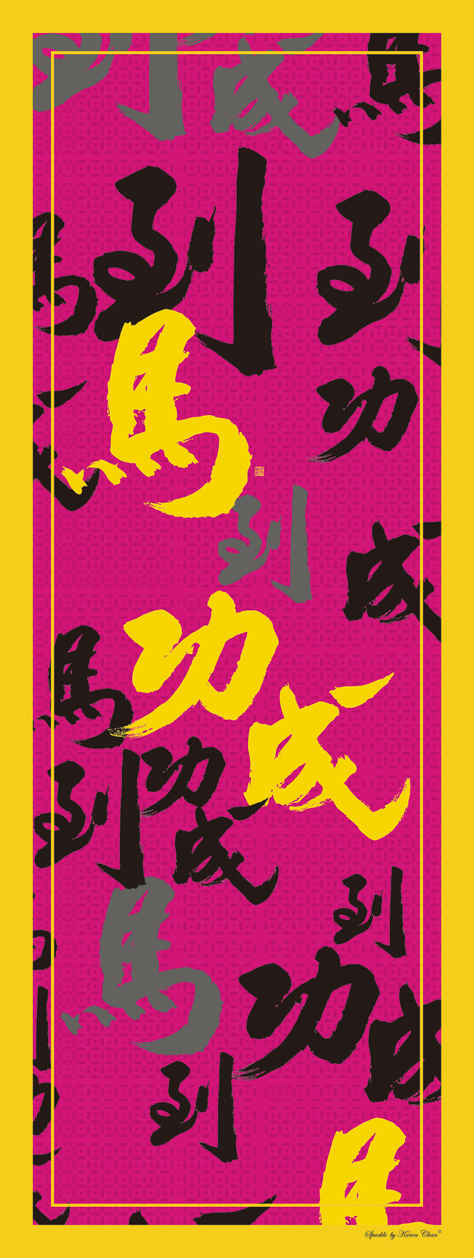 The spectacular calligraphy on this fabric pattern is done by the chairman of HK Calligraphy Association Master Michael Fung exclusively for our brand, and plays on the popular Chinese lucky phrase “The Horse has arrived, and the deed is successful馬到功成”. The name of the piece “Racing Success” plays on the image of the racehorse succeeding first at the winning post.