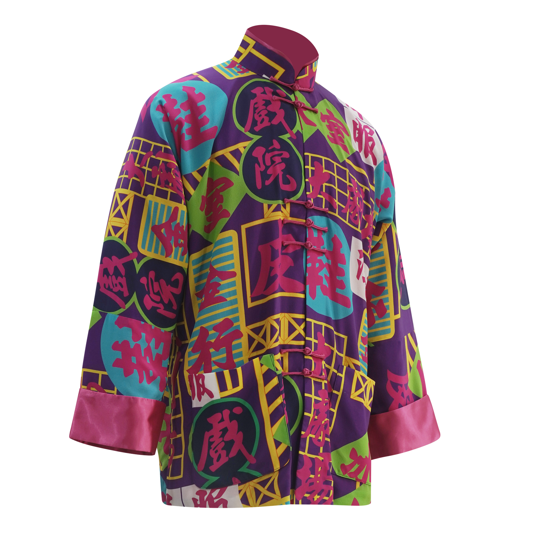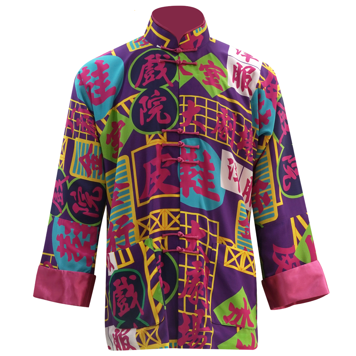 100% pure silk Tang jacket in neon purple, laser-printed with the world-famous night scene of HK – neon signs that blaze up the whole city. Our season-signature n fuchsia silk cuffs are strikingly sharp, and the neon light Chinese characters add a retro touch that is reminiscent of the 1970’s bustling city scene.