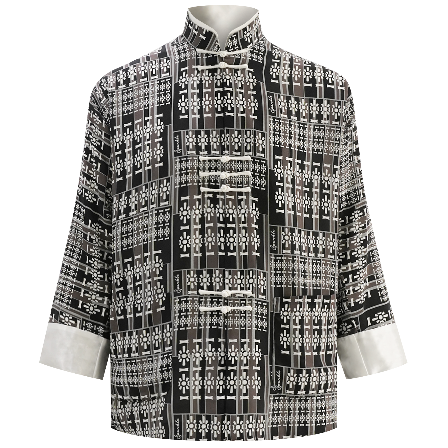 Black and white colored store gate carving details stand out sharp against the black silk background and lends a mysterious vibe to this funky Tang jacket.