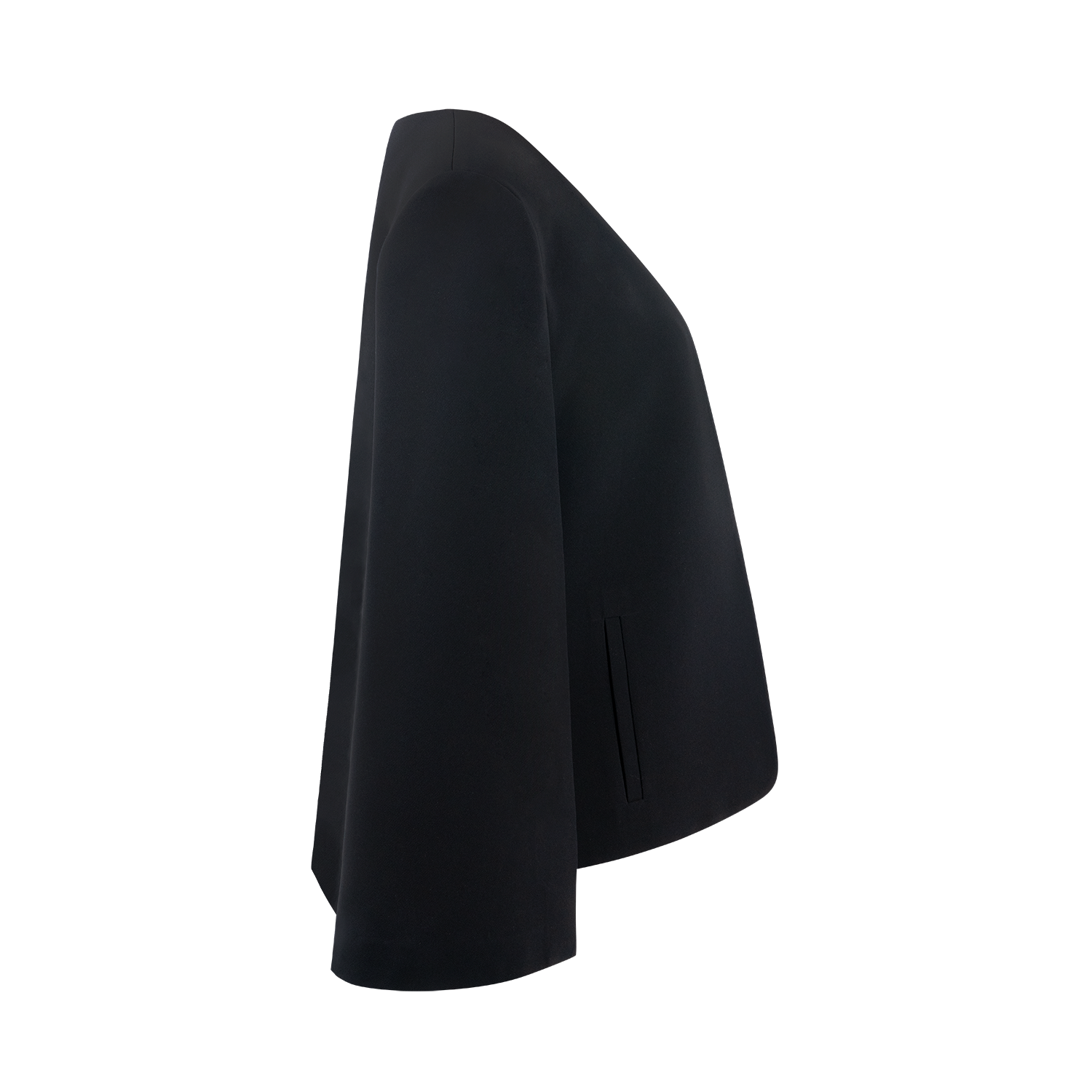This sculptured cape drapes well and is the perfect adornment to your Modern Cheongsam. 100% silk lining in a SPARKLE patented pattern peeping through adds a subtle luxuriousness to this elegant cape.