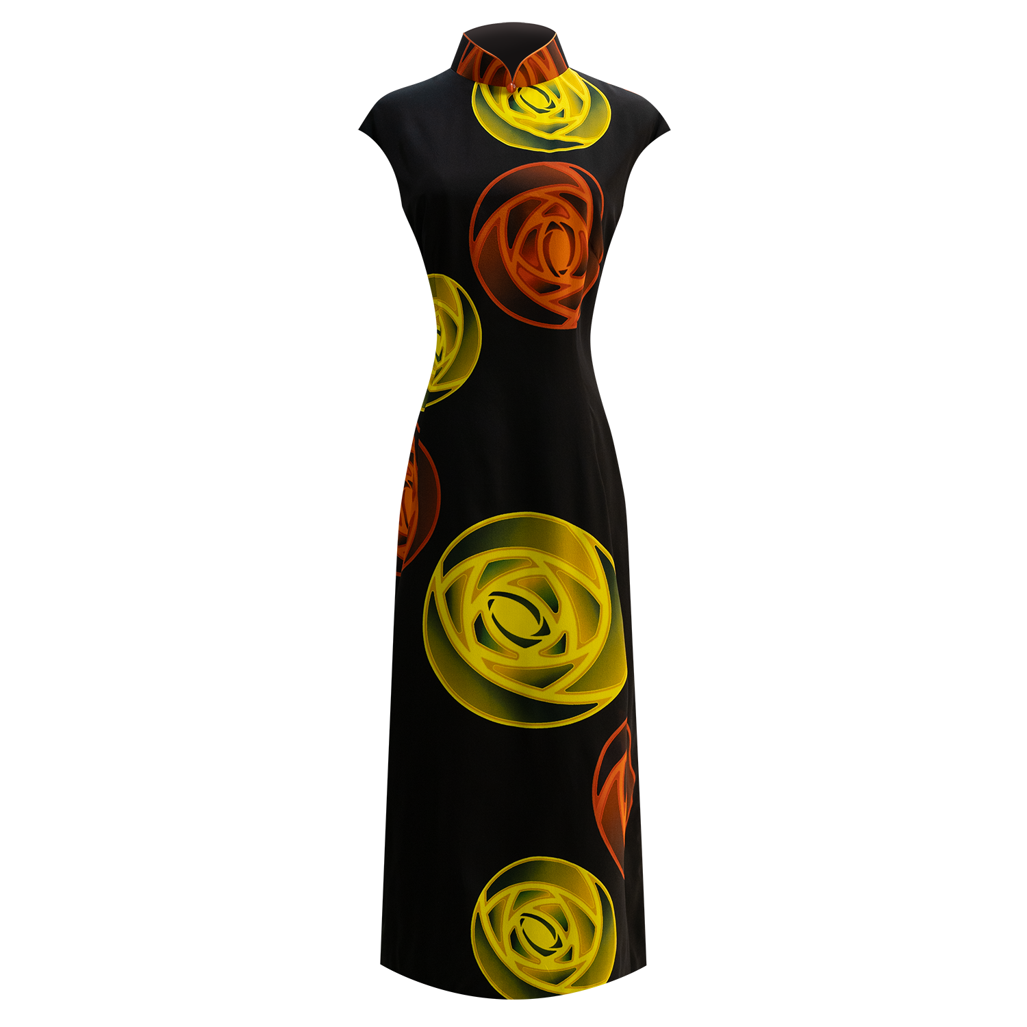 Yellow and orange rose that give off a steampunk feel, together with the black lambskin shoulder piece and off-centre Mandarin Collar give this modern cheongsam a rock star appeal.