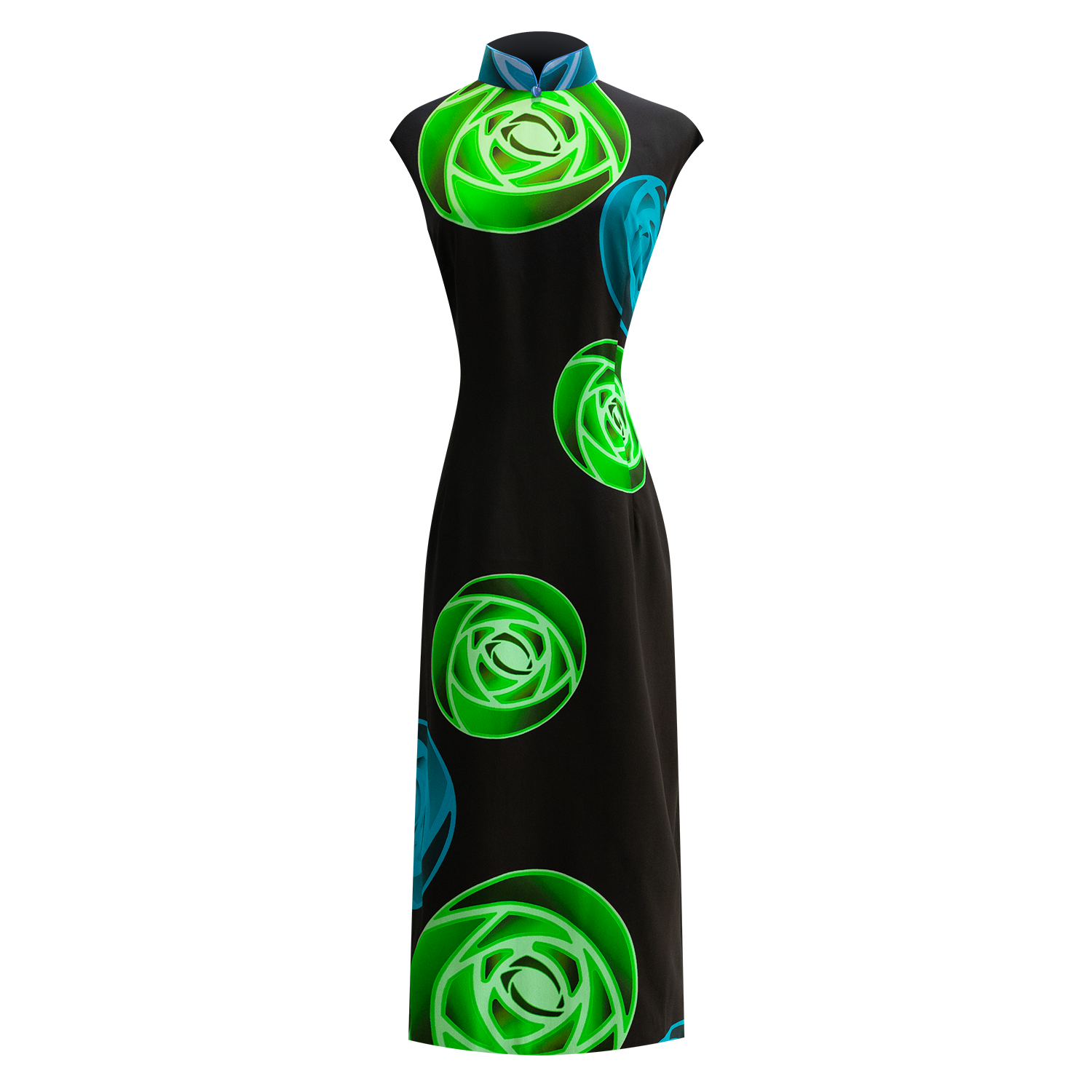 Green and blue rose that give off a steampunk feel, together with the black lambskin shoulder piece and off-centre Mandarin Collar give this modern cheongsam a rock star appeal.