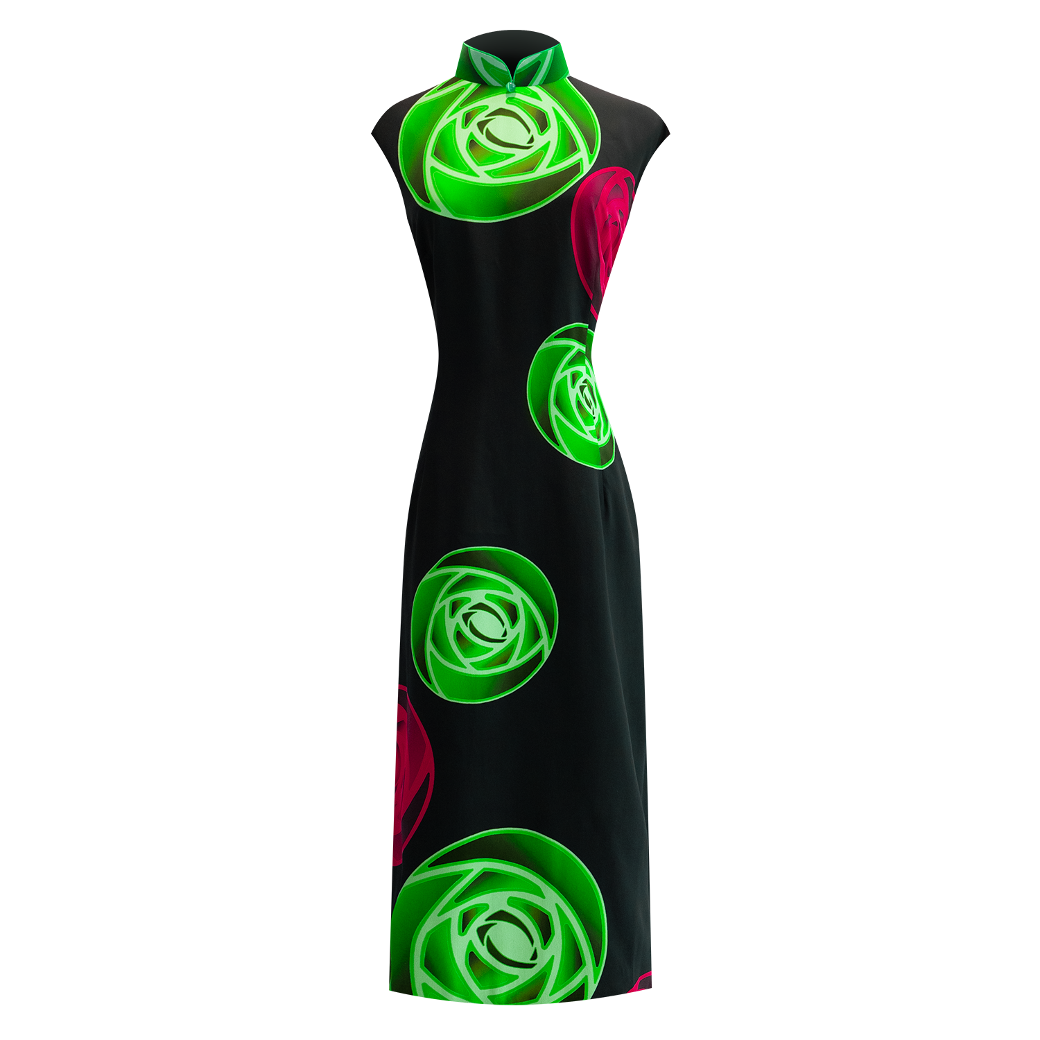 Green and red rose that give off a steampunk feel, together with the black lambskin shoulder piece and off-centre Mandarin Collar give this modern cheongsam a rock star appeal.