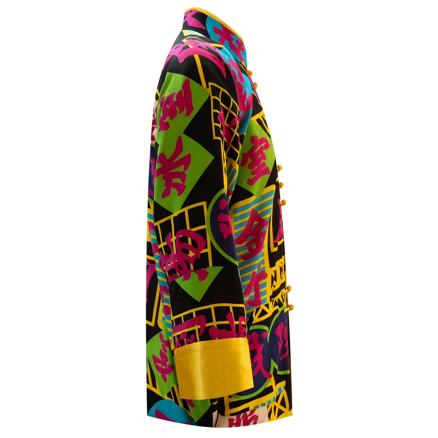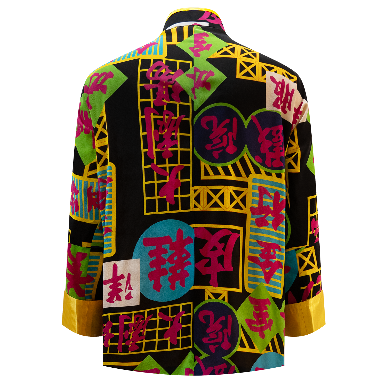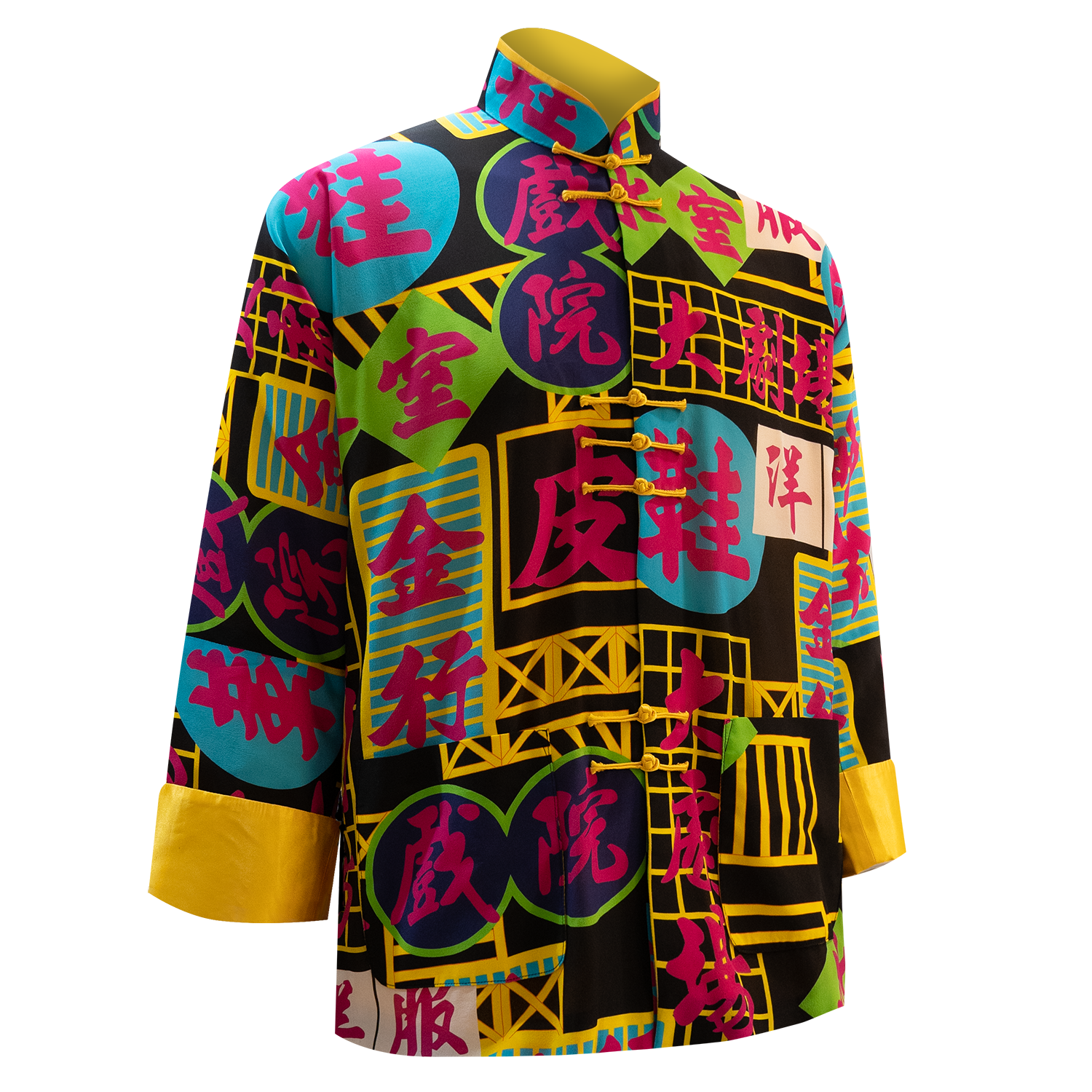100% pure silk Tang jacket in neon black, laser-printed with the world-famous night scene of HK – neon signs that blaze up the whole city. Our season-signature leather Mandarin collar in black and neon fuchsia silk cuffs are strikingly sharp, and the neon light Chinese characters add a retro touch that is reminiscent of the 1970’s bustling city scene.