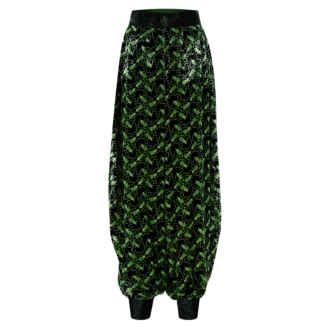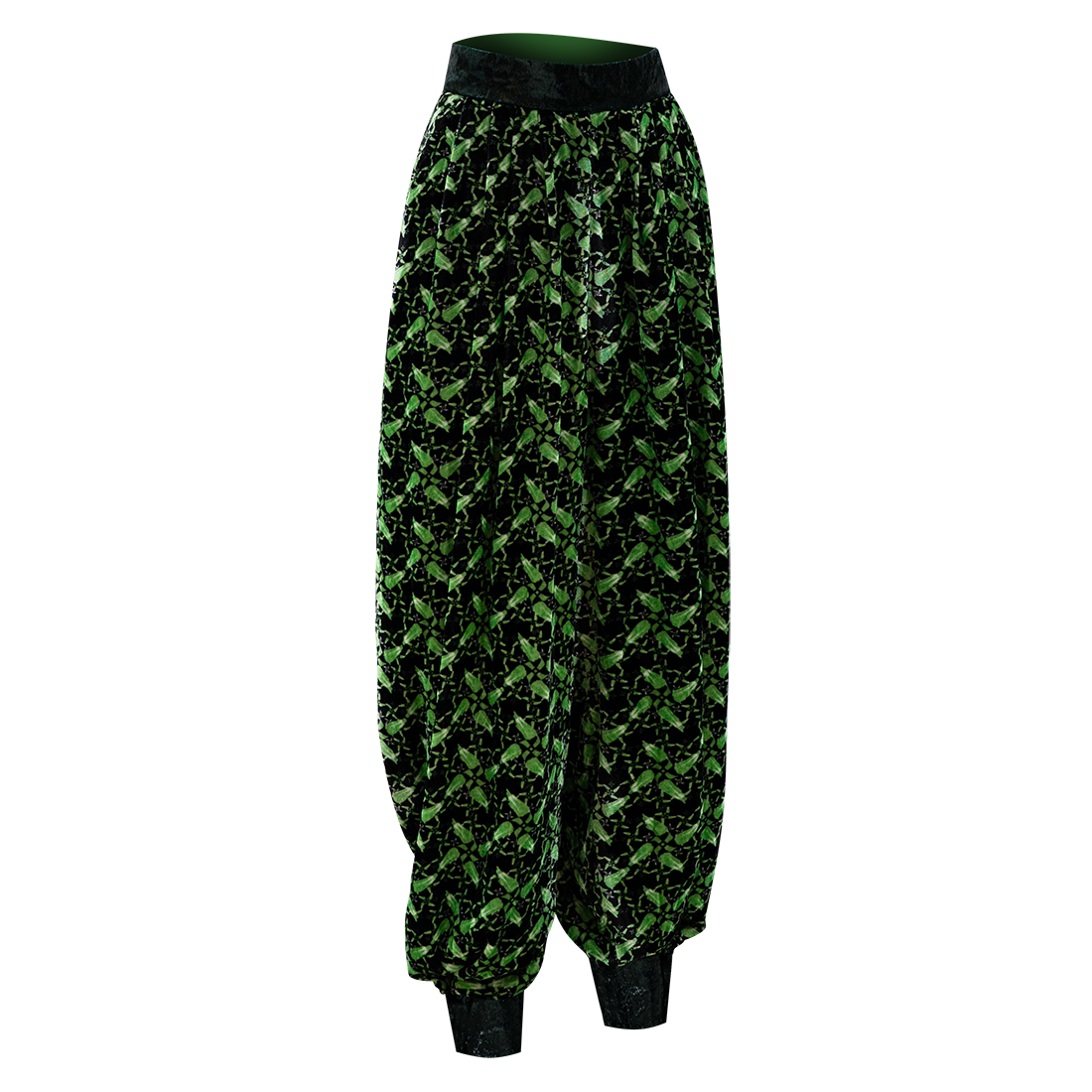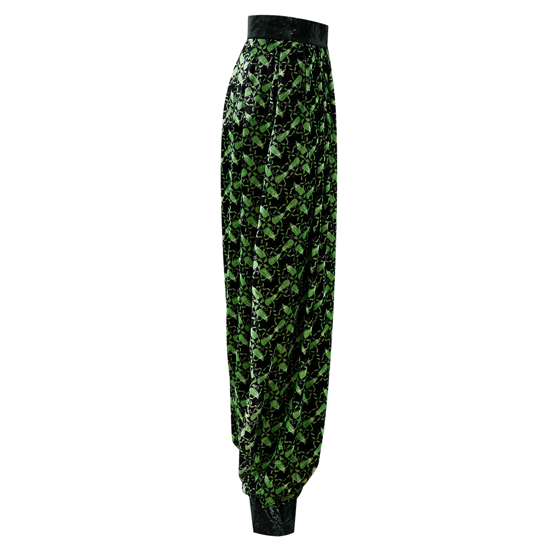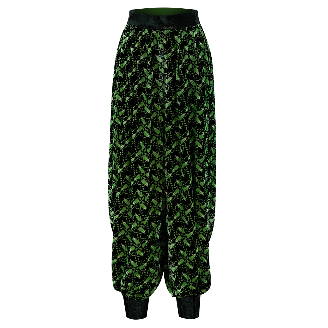 Velvet harem kung-fu pants in【BAICAI】pattern inspired by HKMoA’s priceless “Porcelain Green Chinese Cabbage” snuff bottle.