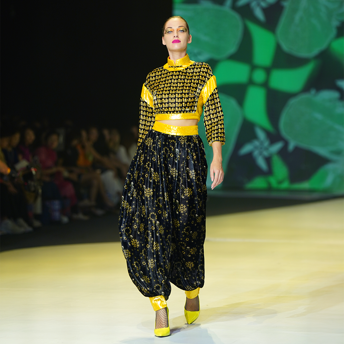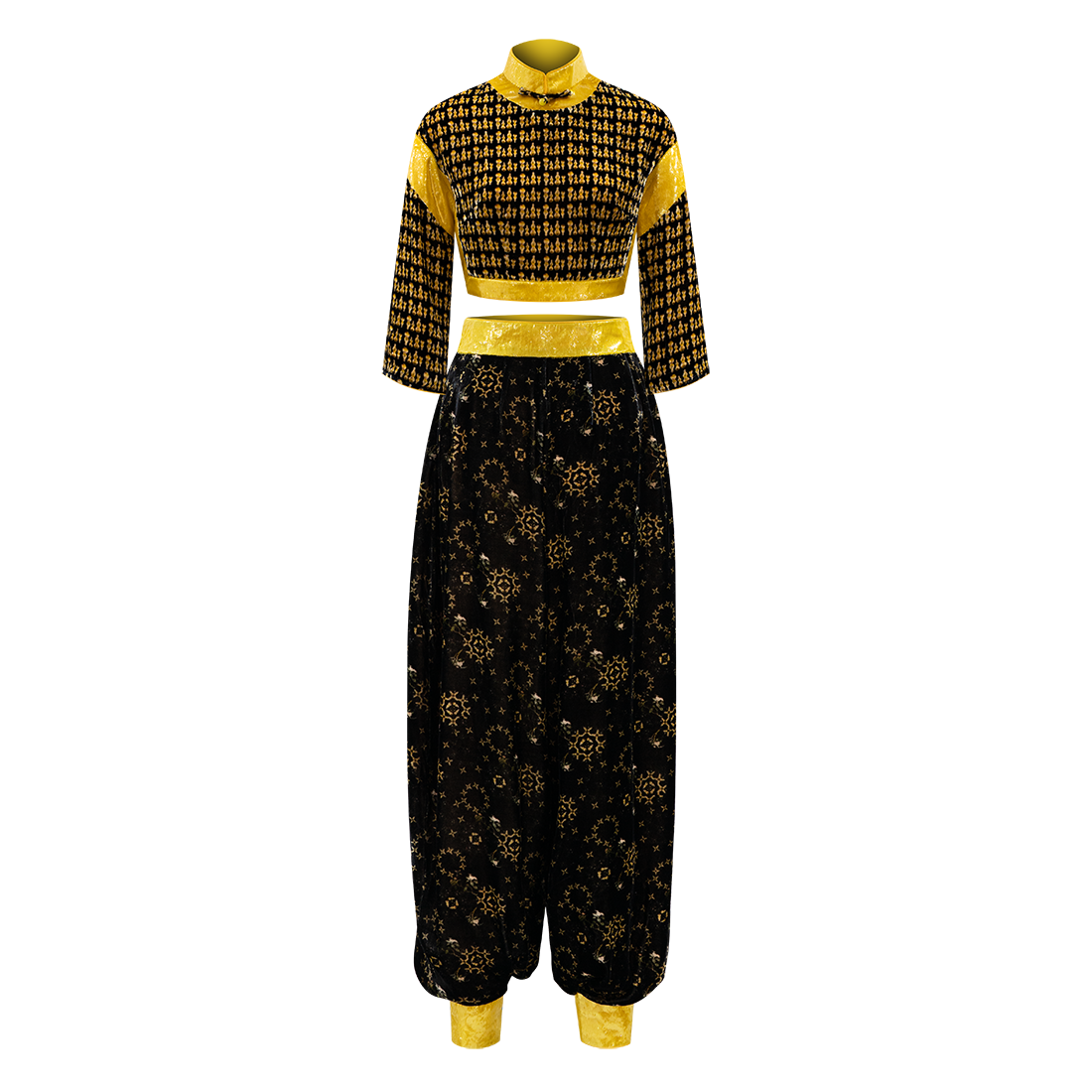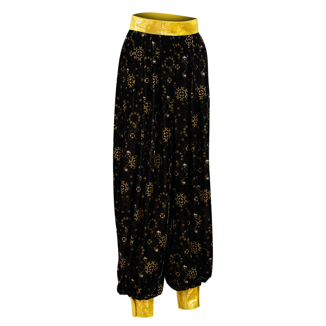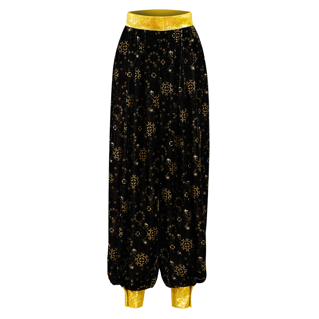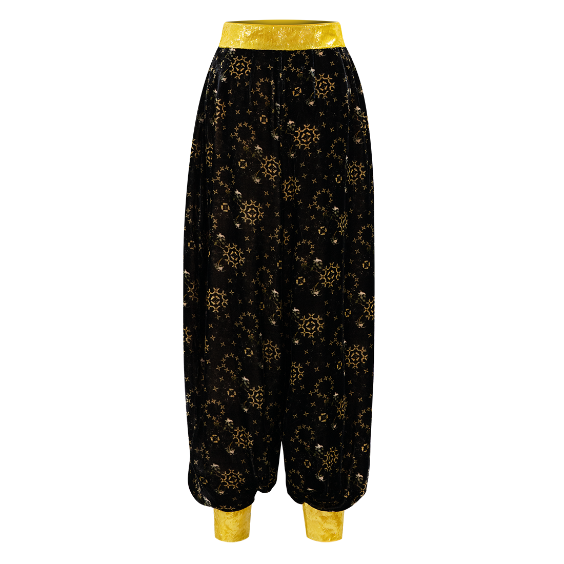 Funky harem style kung-fu pants in【YELLOW FLORAL GOURD】patterned velvet inspired by HKMoA’s priceless Yellow Glass Painted Enamel Floral Motif Snuff Bottle. Bright yellow lurex waistband and cuffs give an extra pop of color to the piece.